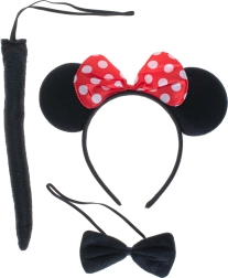 Un adorable set de disfraz que convierte a cualquier niño en un tierno ratoncito en un instante. Incluye una diadema con orejas y lazo rojo con lunares, pajarita negra y una cola suave. Una gran opción para carnaval, Halloween y fiestas temáticas: talla universal, uso cómodo y acabado textil resistente.