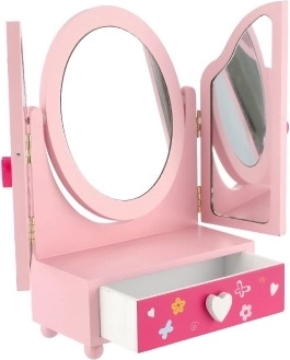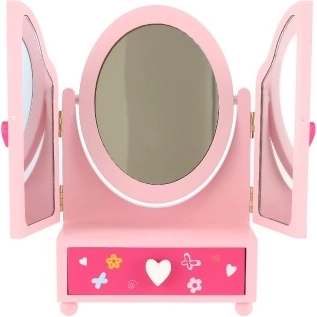 El producto está fabricado en madera de alta calidad y cuenta con una estructura estable. La medida aproximada del espejo abierto es de 33 cm; el embalaje mide aprox. 18 × 26 × 10 cm. Apto a partir de 3 años.