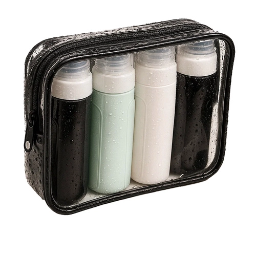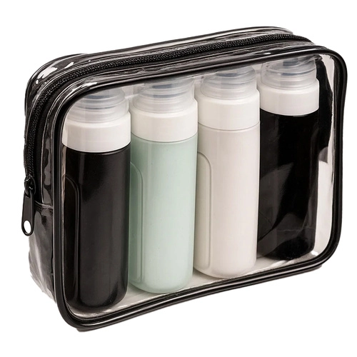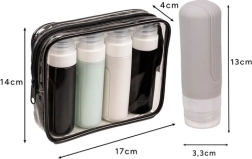 Presentamos el práctico set de viaje de la marca Trizand, perfecto para todas tus necesidades en ruta. Se trata de un conjunto de cuatro botellas de silicona y un neceser transparente e impermeable que cumple con los estándares TSA/IATA para transportar líquidos en el equipaje de mano. ¡Olvídate de los champús derramados en la maleta!