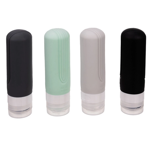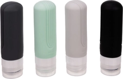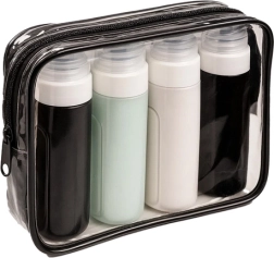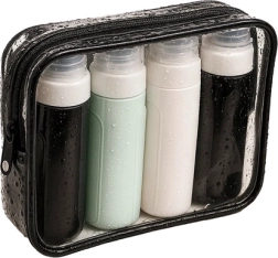 Set de cosmética de viaje con cuatro botellas flexibles, conformes con los requisitos aéreos, impermeables e ideales para el avión. Aporta comodidad y organización en tus desplazamientos.