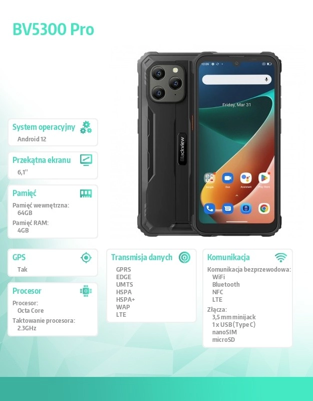 El Blackview BV5300 Pro destaca por su pantalla IPS de 6,1", que ofrece una imagen clara y nítida con una resolución de 1560 x 720 píxeles. El potente procesador de ocho núcleos MediaTek Helio P35 alcanza hasta 2,3 GHz, lo que garantiza un funcionamiento rápido y fluido del sistema, respaldado por 4 GB de RAM y 64 GB de memoria interna. La memoria se puede ampliar mediante tarjeta microSD hasta 512 GB, lo que proporciona espacio suficiente para todas tus necesidades.