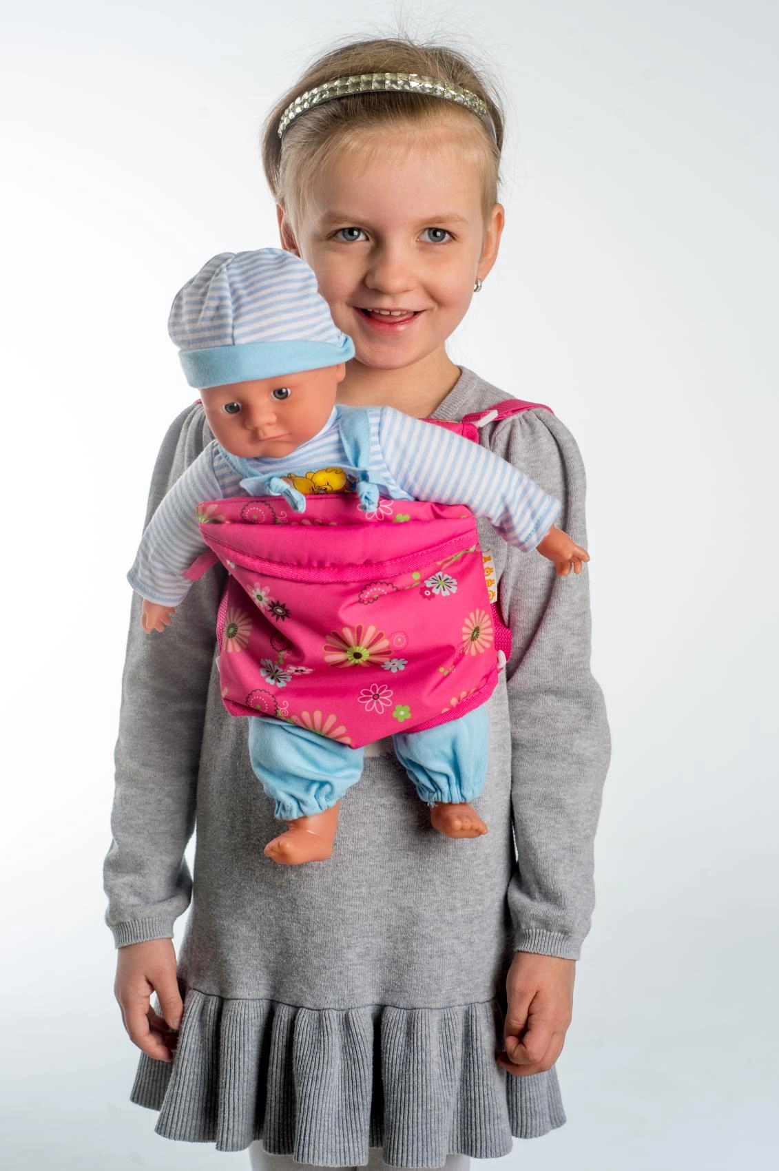 Adorable canguro de tela para pequeñas cuidadoras que permite a los niños llevar cómodamente sus muñecas y ositos de peluche favoritos. Gracias al tamaño del bolsillo de 29 × 20 cm y a los tirantes ajustables, se adapta fácilmente a la complexión infantil y garantiza un transporte seguro y cómodo del juguete en casa o de paseo.