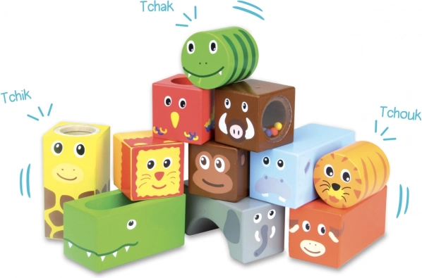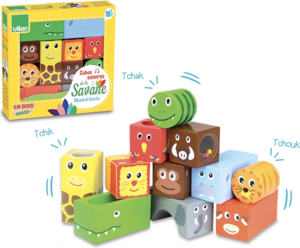 Los bloques de madera sonoros Sabana de VILAC son una elección ideal para las primeras exploraciones del mundo. Cada bloque esconde un sonido o efecto diferente y, gracias a la madera resistente, se adapta perfectamente a las manos de los niños. El juego fomenta de forma natural el desarrollo de los sentidos y la creatividad.