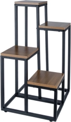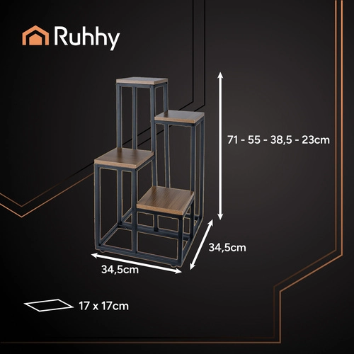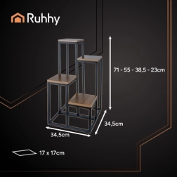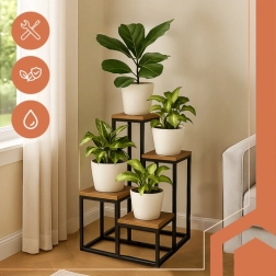 El elegante soporte de plantas de pie RUHHY es una estructura de cuatro niveles que permite exhibir varias plantas en un espacio pequeño. Su diseño moderno con marco metálico y baldas de madera encaja en cualquier interior. La estructura estable y robusta puede soportar hasta 50 kg de carga y está equipada con protección para el suelo mediante patas niveladoras.