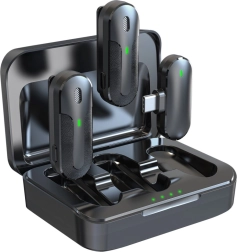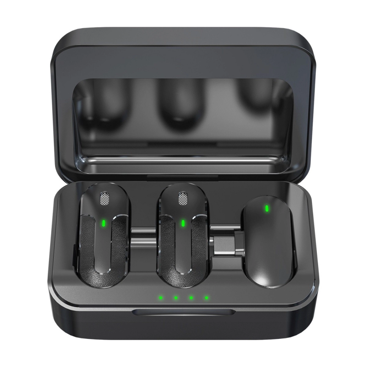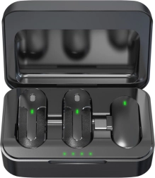 Los micrófonos están equipados con prácticos clips para fijarlos fácilmente a la ropa. El estuche de carga ofrece protección y amplía el tiempo de uso, permitiendo hasta cuatro cargas para grabar todo el día sin preocuparse por la batería.