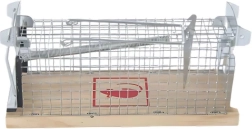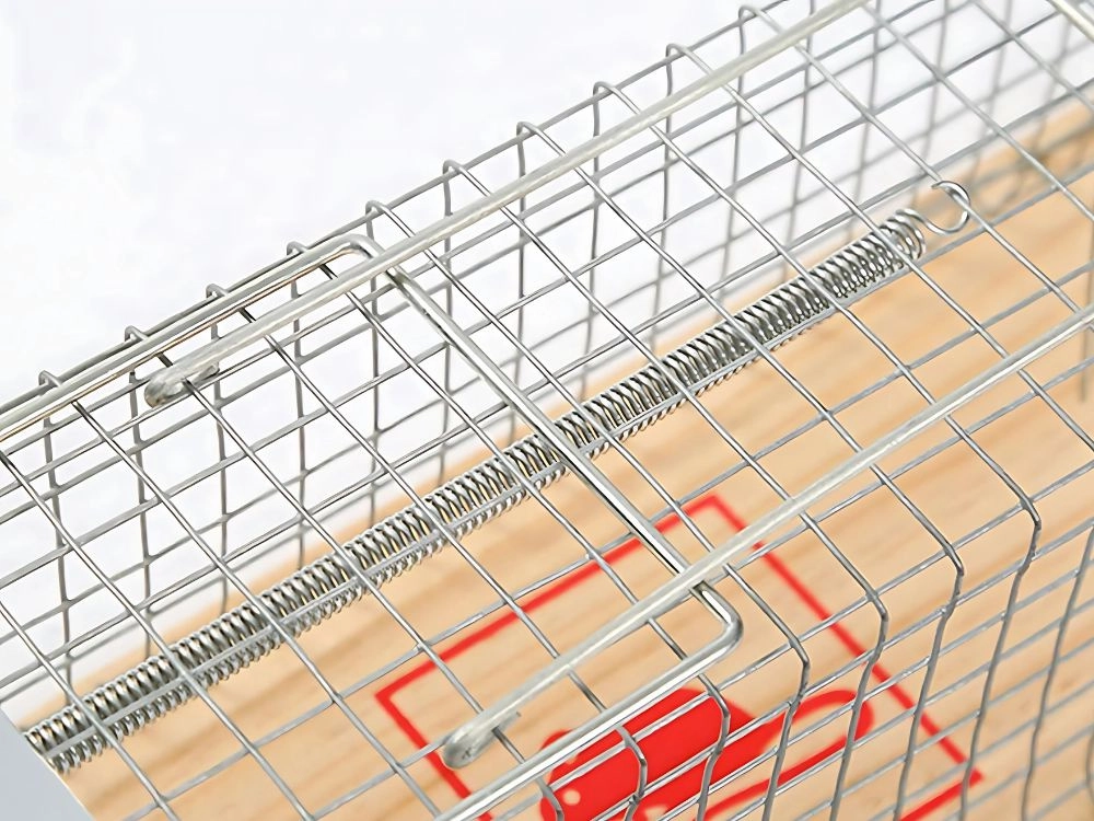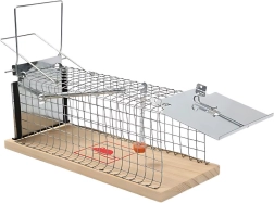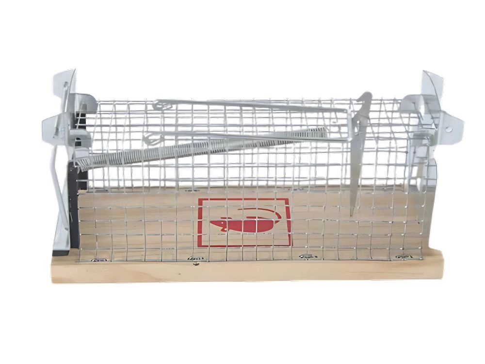 Esta trampa metálica está diseñada para una captura segura y eficaz de pequeños plagas sin necesidad de usar venenos. Está fabricada con alambre de acero y una base de madera, lo que proporciona durabilidad y manipulación segura.