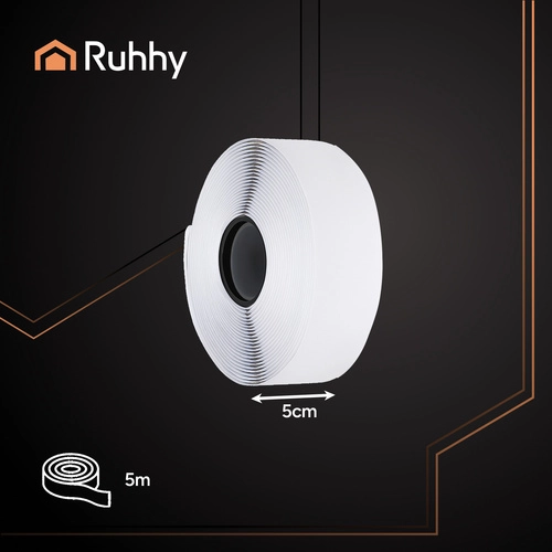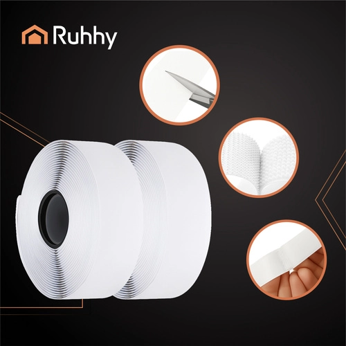 La cinta de velcro autoadhesiva RUHHY consta de dos partes: gancho y bucle, que permiten una unión segura y reutilizable. La capa autoadhesiva facilita un montaje rápido en diversas superficies, como plástico o vidrio.