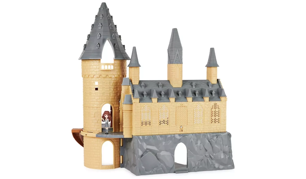 El castillo cuenta con elementos arquitectónicos detallados y colores vibrantes que realzan la magia del mundo de Harry Potter.