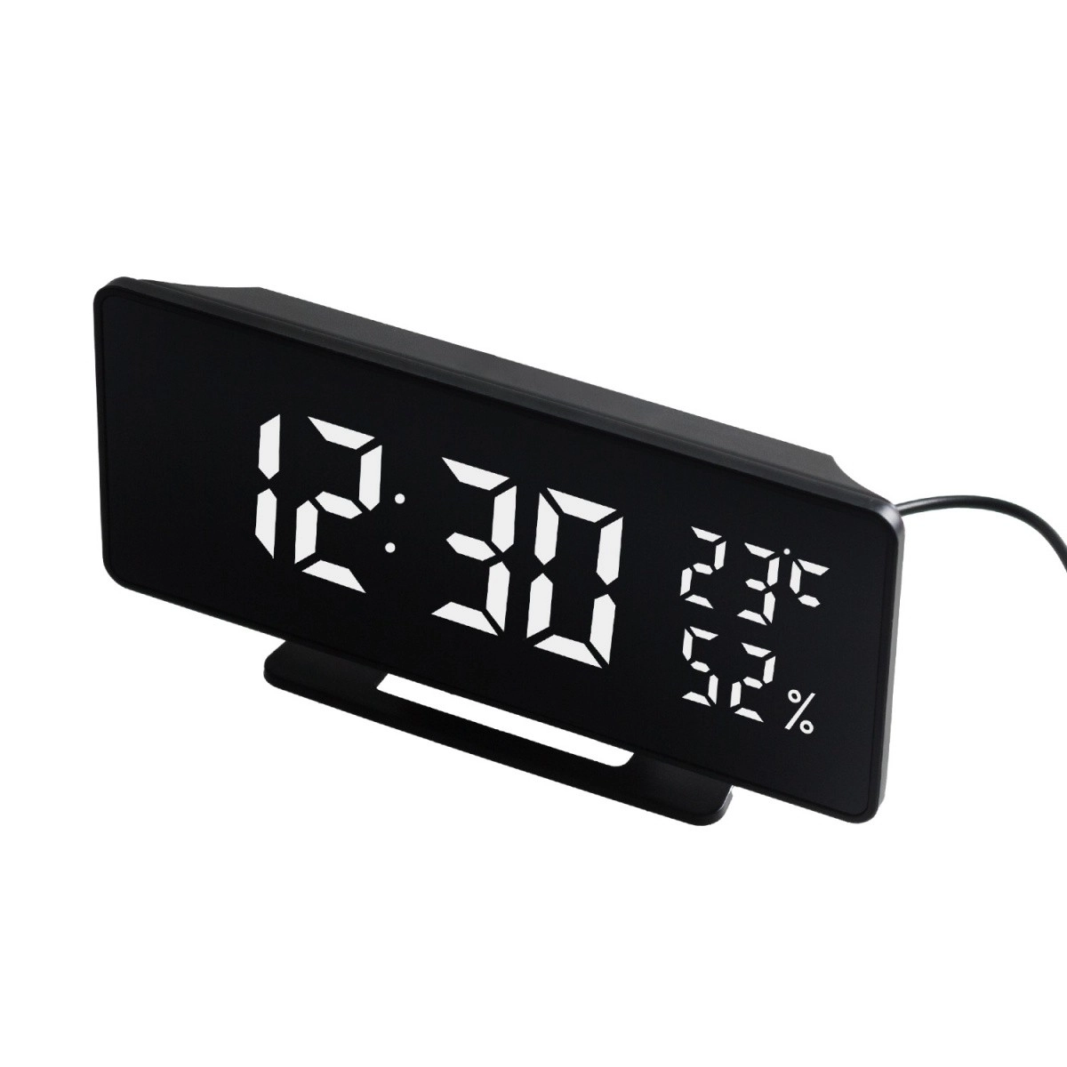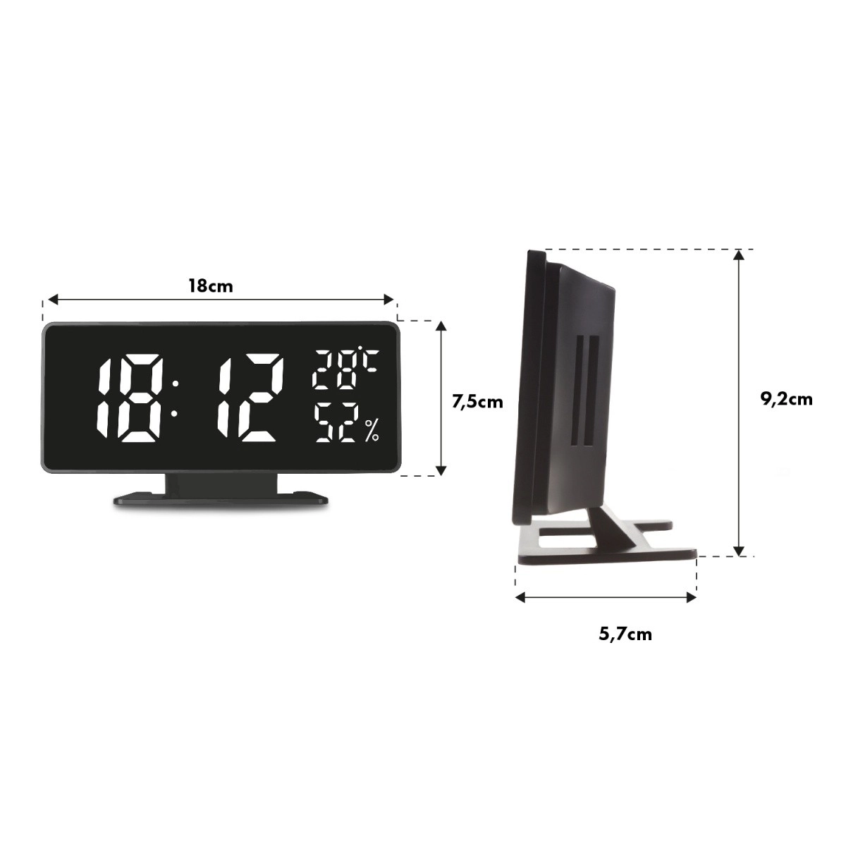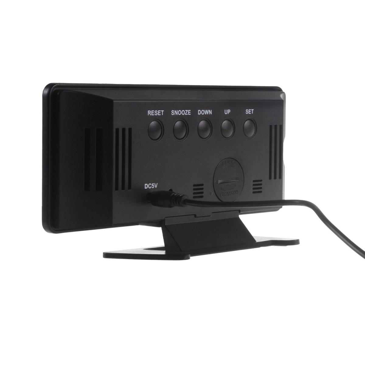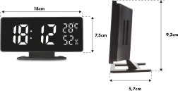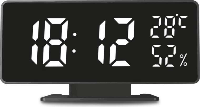 Este despertador ofrece formato de hora opcional de 12/24 horas y medición de temperatura en °C o °F. Se adapta automáticamente a la iluminación de la habitación y dispone de doble modo de visualización. La pila CR2032 mantiene la configuración de la memoria en caso de corte de energía.