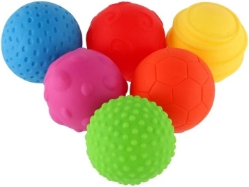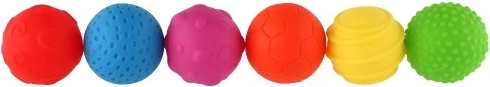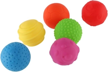 Cada una de las 6 pelotas tiene una superficie única que desarrolla el tacto y fomenta el descubrimiento curioso del mundo a través del contacto.