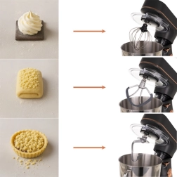 - Accesorios incluidos: gancho para masa, batidor plano, globo batidor, tapa, espátula, separador de huevos, manga pastelera con 24 boquillas en organizador.