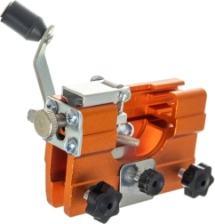 La instalación se realiza directamente en la espada, sin desmontar la cadena. La sujeción robusta y la manivela ergonómica minimizan las vibraciones y el riesgo de deslizamiento. La resistente construcción de aluminio anodizado con tornillería de acero está preparada para un uso exigente tanto en el taller como en el bosque.