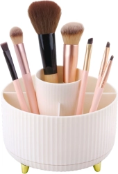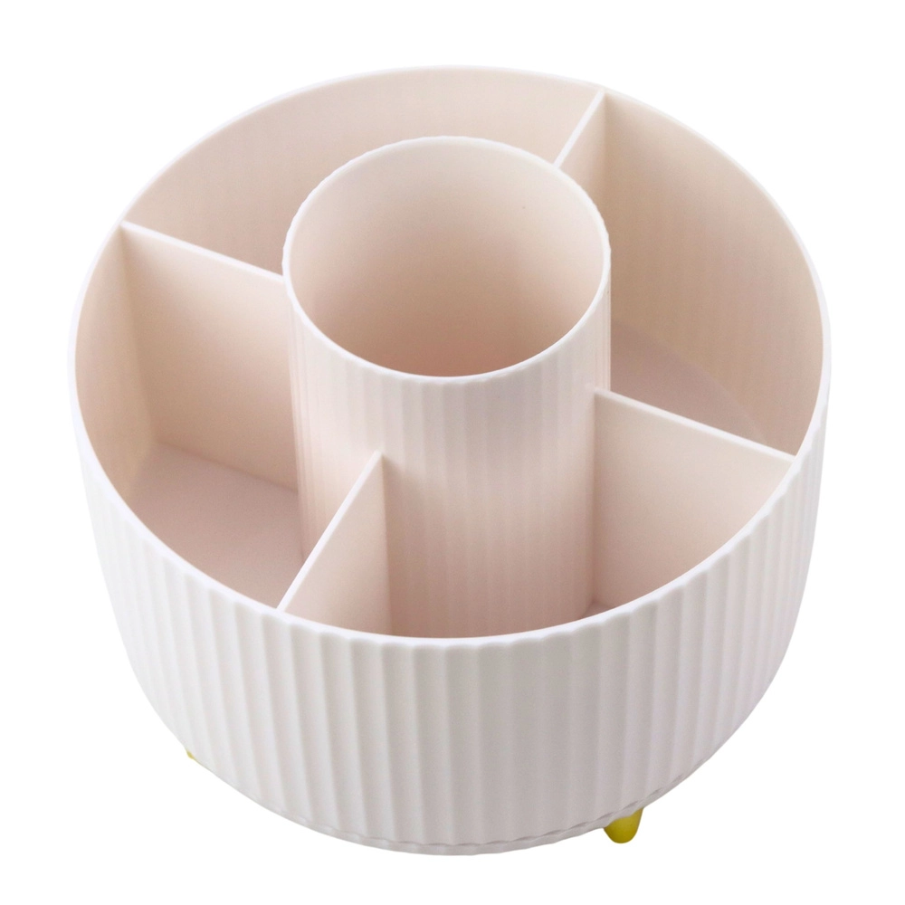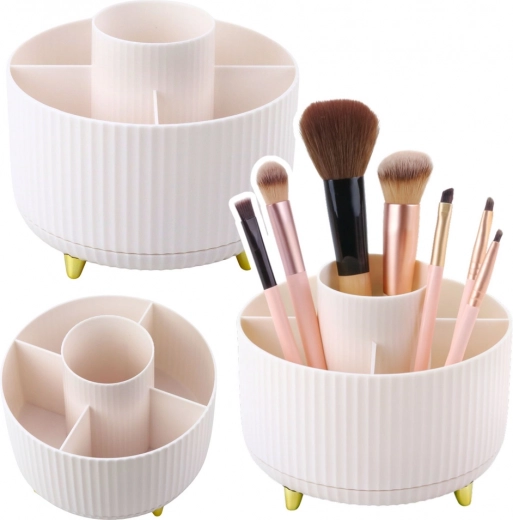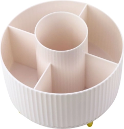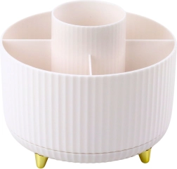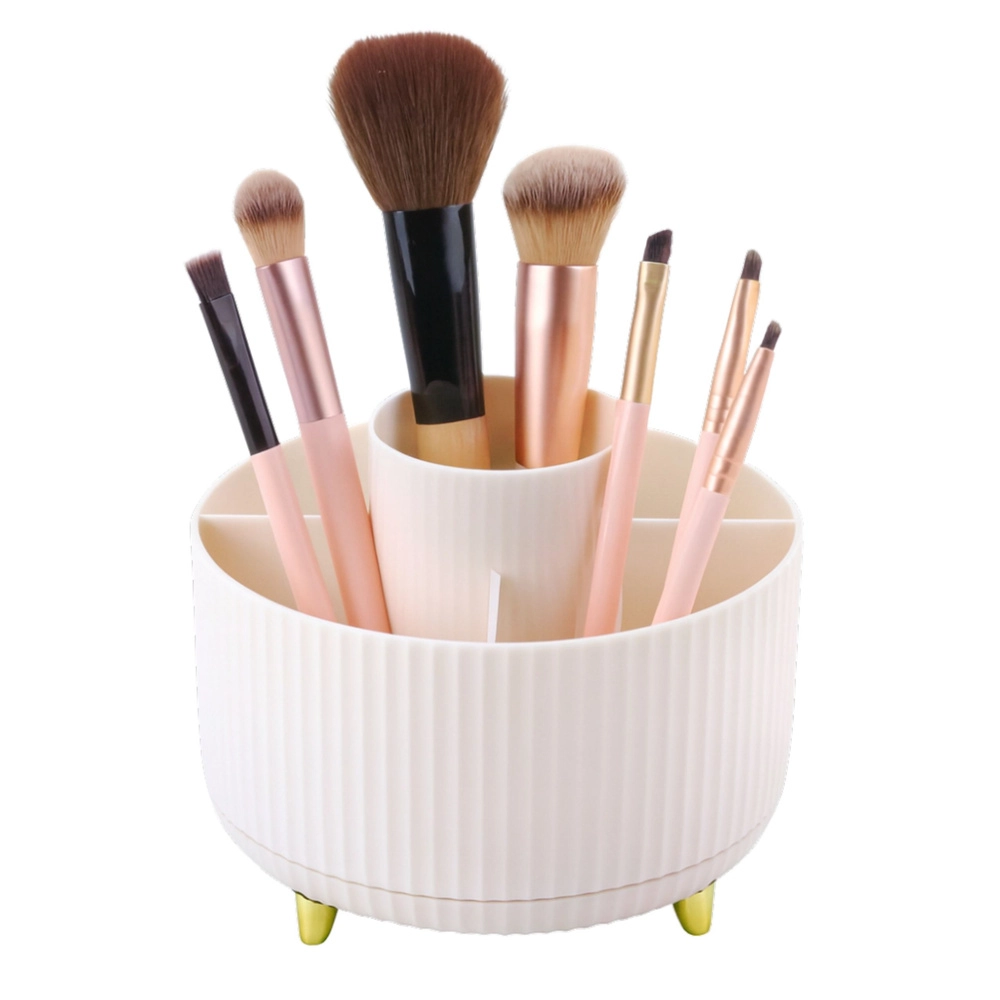 Organizador de cosméticos elegante y práctico con base giratoria 360° que te ayuda a mantener todo en perfecto orden. Ofrece 5 compartimentos espaciosos para brochas, barras de labios, lápices y otros accesorios. Fabricado en ABS resistente, cuenta con una estructura estable y un diseño abierto para acceder fácilmente incluso a brochas más largas.