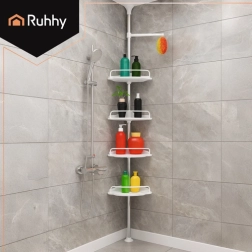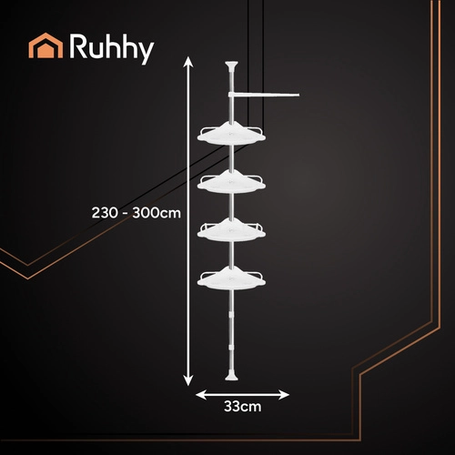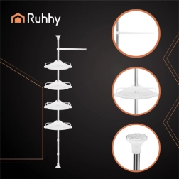 Mantén el baño perfectamente ordenado con la estantería de ducha telescópica de esquina RUHHY. Altura ajustable 240–310 cm que se adapta a la mayoría de los baños sin taladrar. Cuatro niveles de estantes, ganchos y portatoallas para guardar cómodamente cosméticos y accesorios de baño. Las puntas antideslizantes garantizan estabilidad y el montaje rápido aporta orden y estilo en pocos minutos.