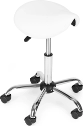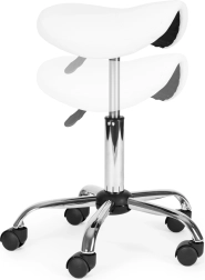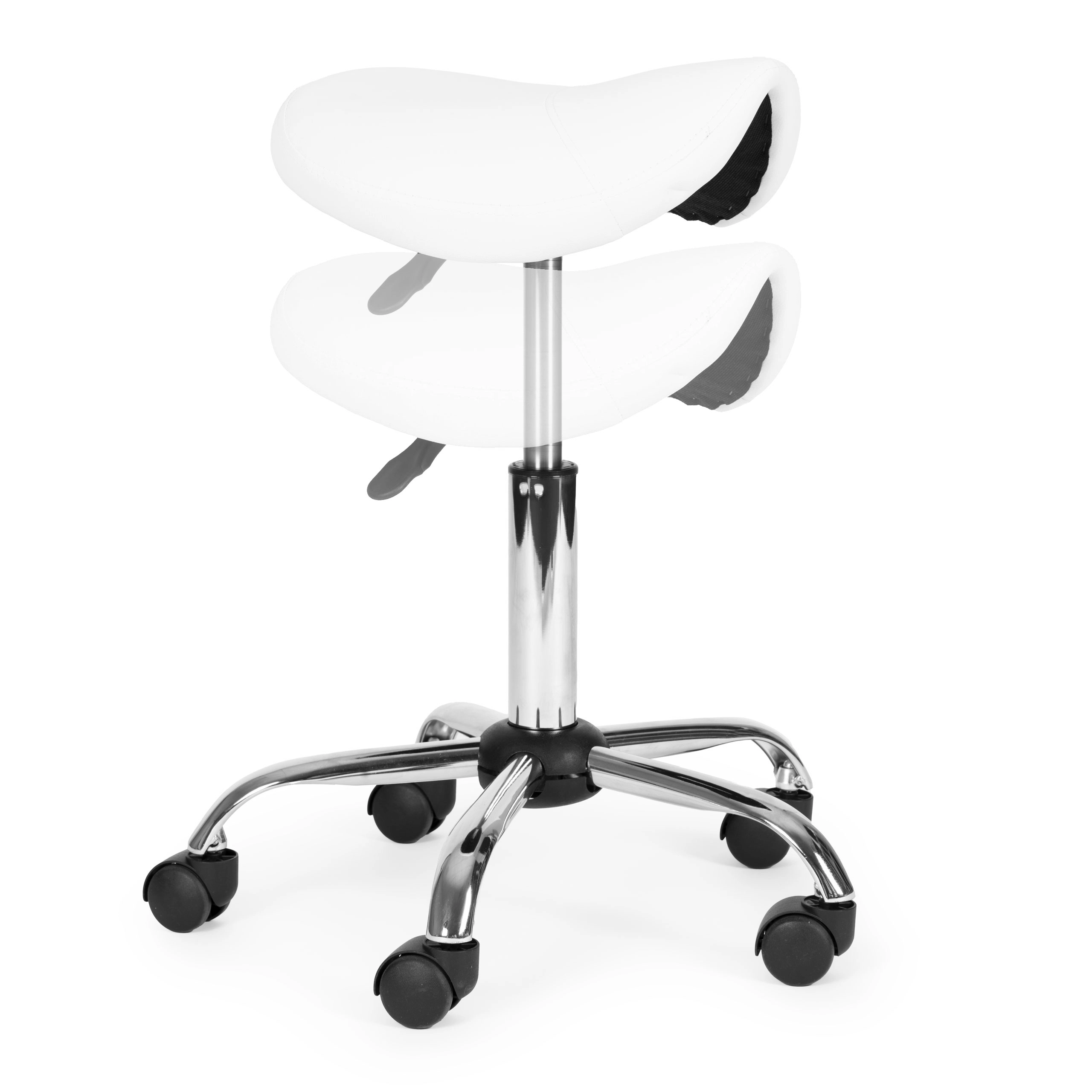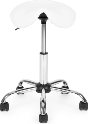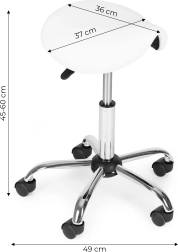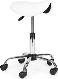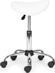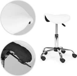 Taburete profesional giratorio tipo silla de montar para salones y clínicas que ofrece asiento ergonómico, ajuste de altura continuo, asiento giratorio 360° y base estable de cinco radios con ruedas. Tapizado resistente de cuero PVC, cómoda espuma de 4 cm y alta capacidad de carga de 150 kg garantizan confort, movilidad y larga vida útil.
