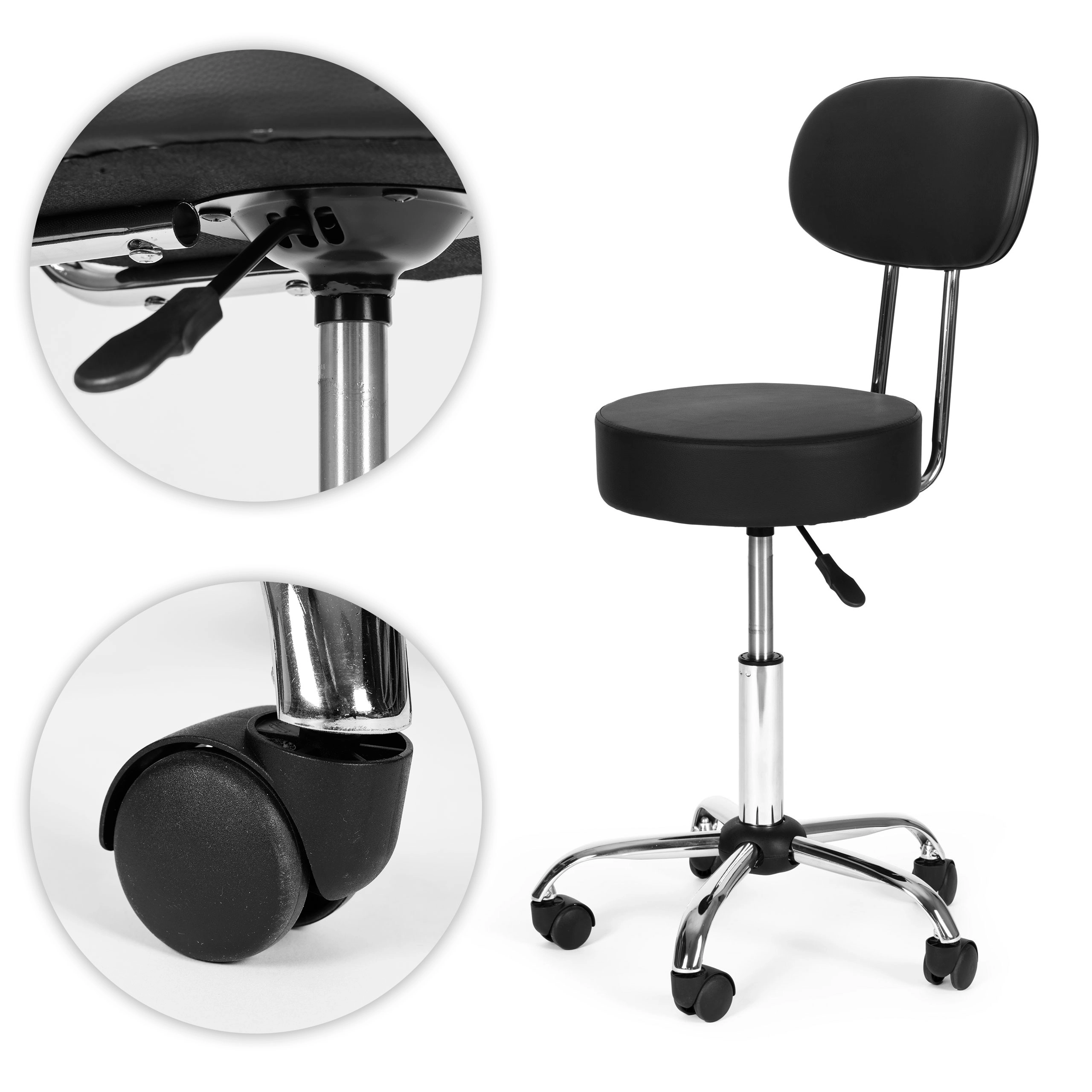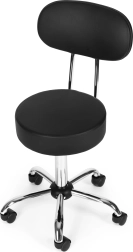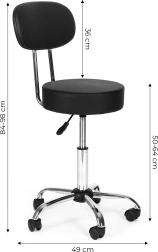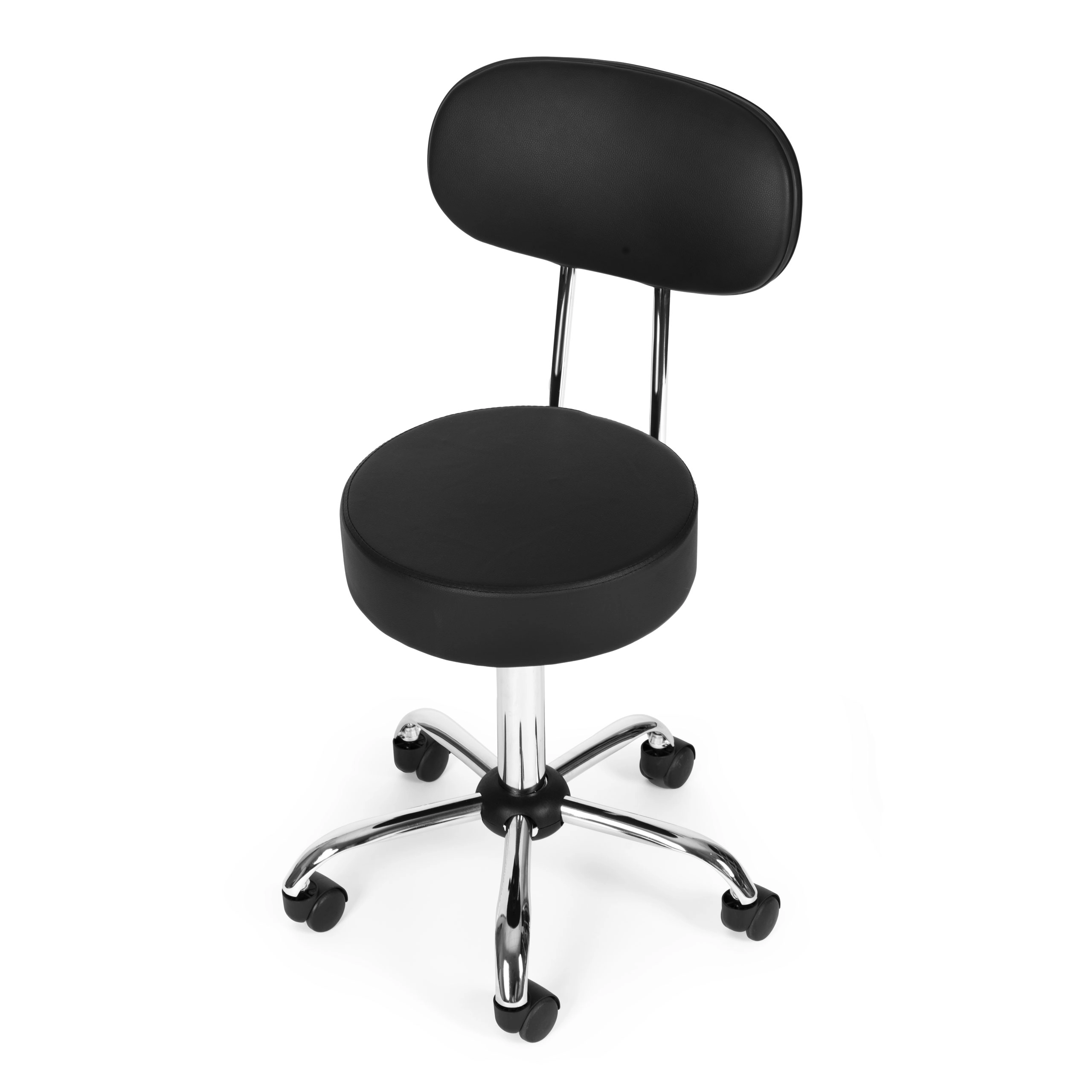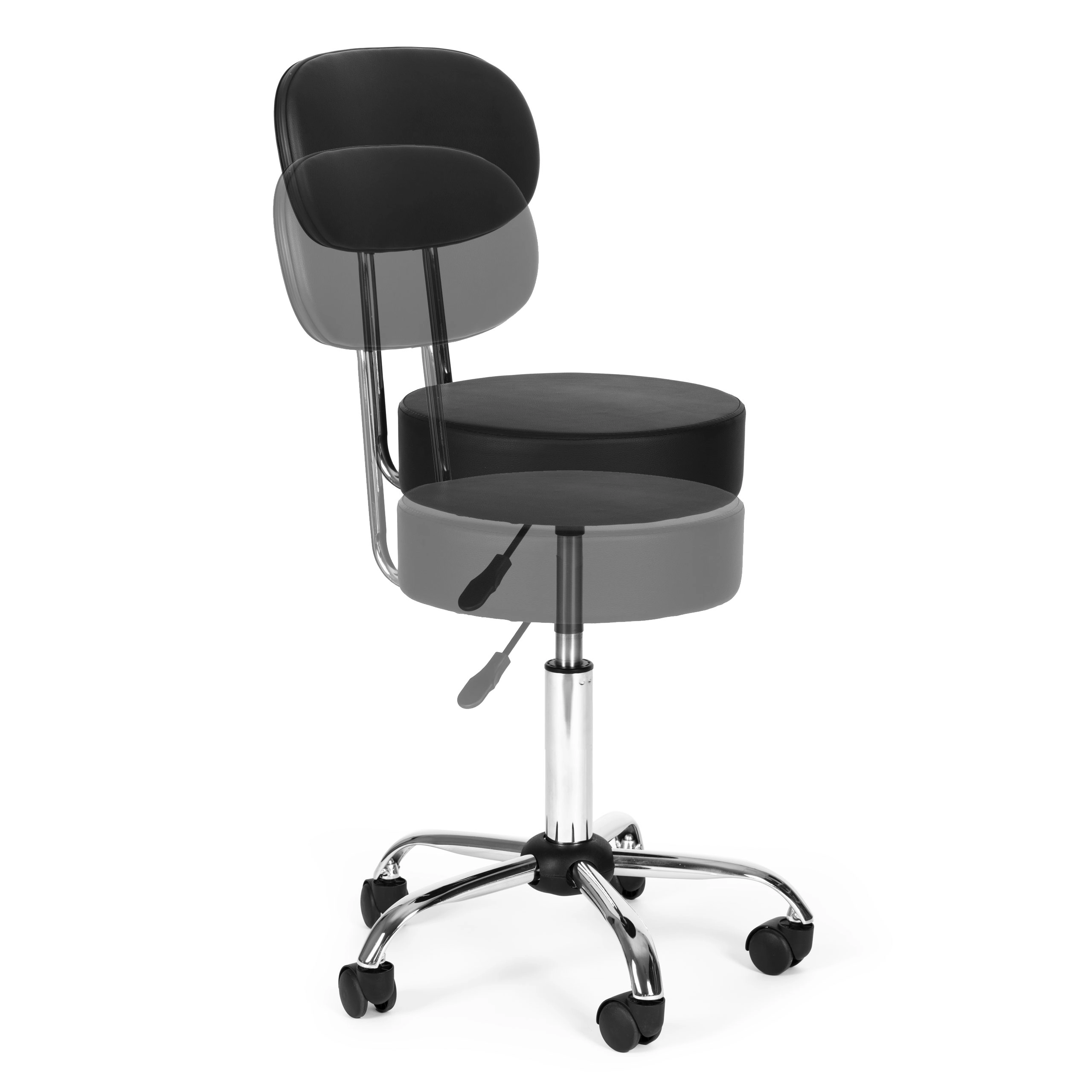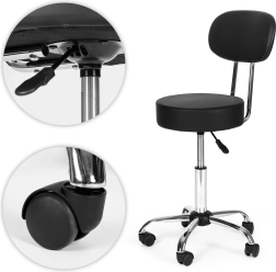 Taburete giratorio profesional con respaldo para salones de belleza, peluquerías y ámbitos sanitarios. Ofrece ajuste de altura continuo, asiento giratorio 360°, estructura metálica estable y tapizado duradero de piel PVC. Gracias a la suave espuma de 8 cm, la base de cinco radios con ruedas y la capacidad de carga de 136 kg, garantiza comodidad, movilidad y larga vida útil.
