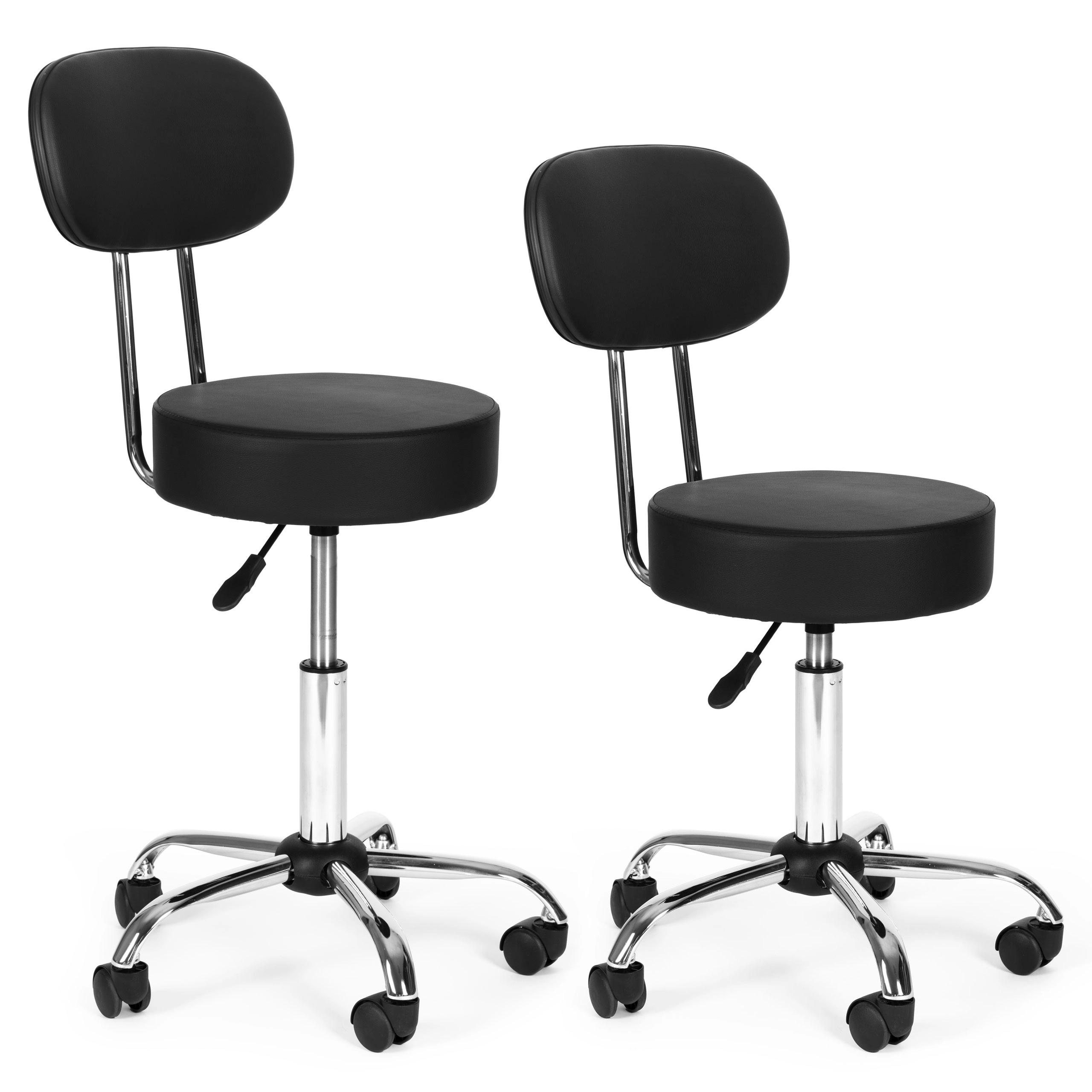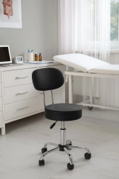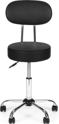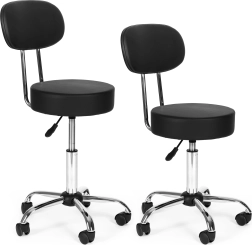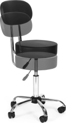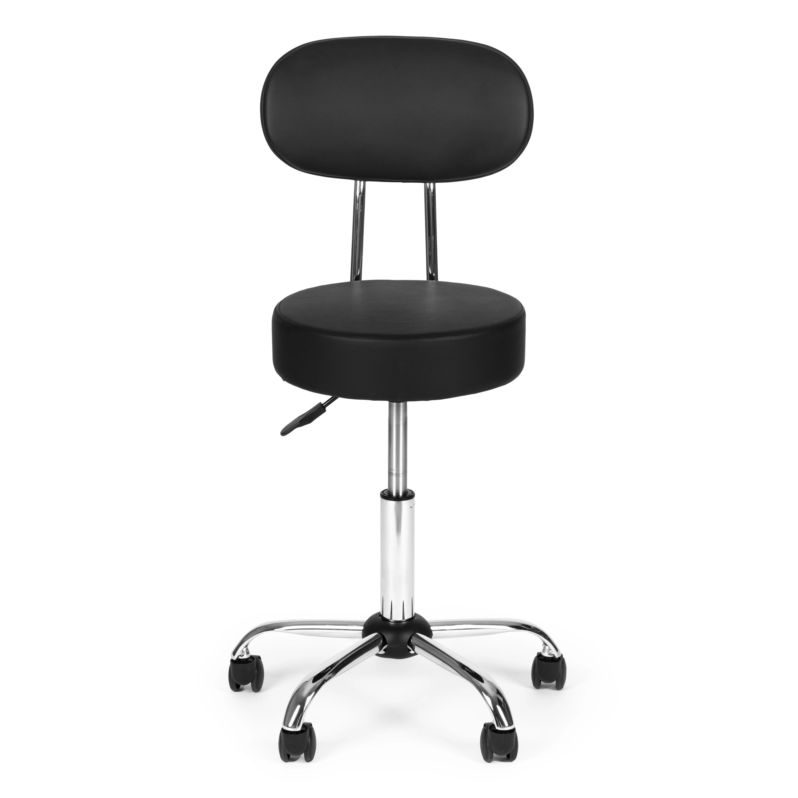 Taburete giratorio profesional con respaldo para salones de belleza, peluquerías y ámbitos sanitarios. Ofrece ajuste de altura continuo, asiento giratorio 360°, estructura metálica estable y tapizado duradero de piel PVC. Gracias a la suave espuma de 8 cm, la base de cinco radios con ruedas y la capacidad de carga de 136 kg, garantiza comodidad, movilidad y larga vida útil.