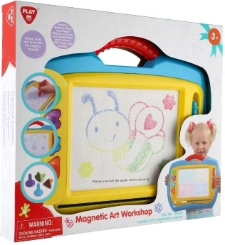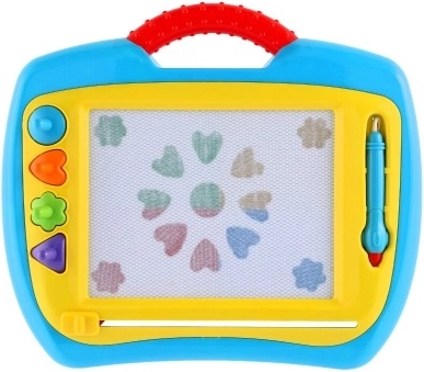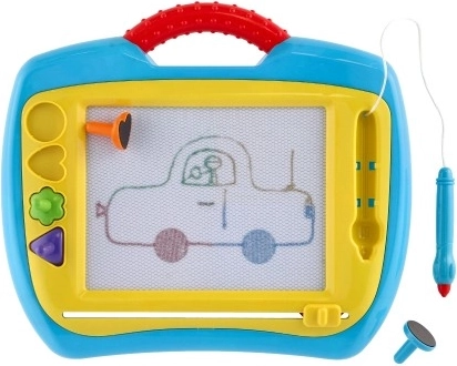 Incluye un lápiz magnético y sellos con formas (según variante), que añaden detalles divertidos a los dibujos. Perfecto como regalo para niños a partir de 3 años, favorece la concentración y entrena la coordinación ojo–mano.