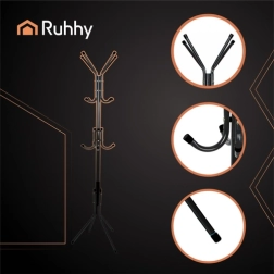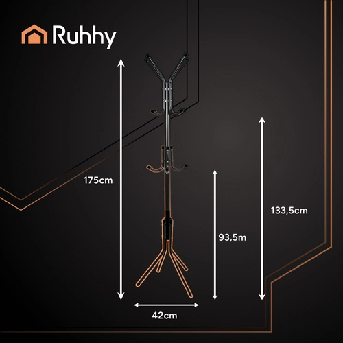 El elegante perchero de pie RUHHY ofrece una solución práctica y estable para recibidores, dormitorios, oficinas y salas de espera. Gracias a sus tres niveles de colgado, su sólida estructura metálica con 4 patas y las puntas redondeadas de los ganchos, mantiene abrigos, chaquetas, bufandas y bolsos de forma segura y ordenada. El diseño independiente permite moverlo fácilmente sin taladros ni herramientas.