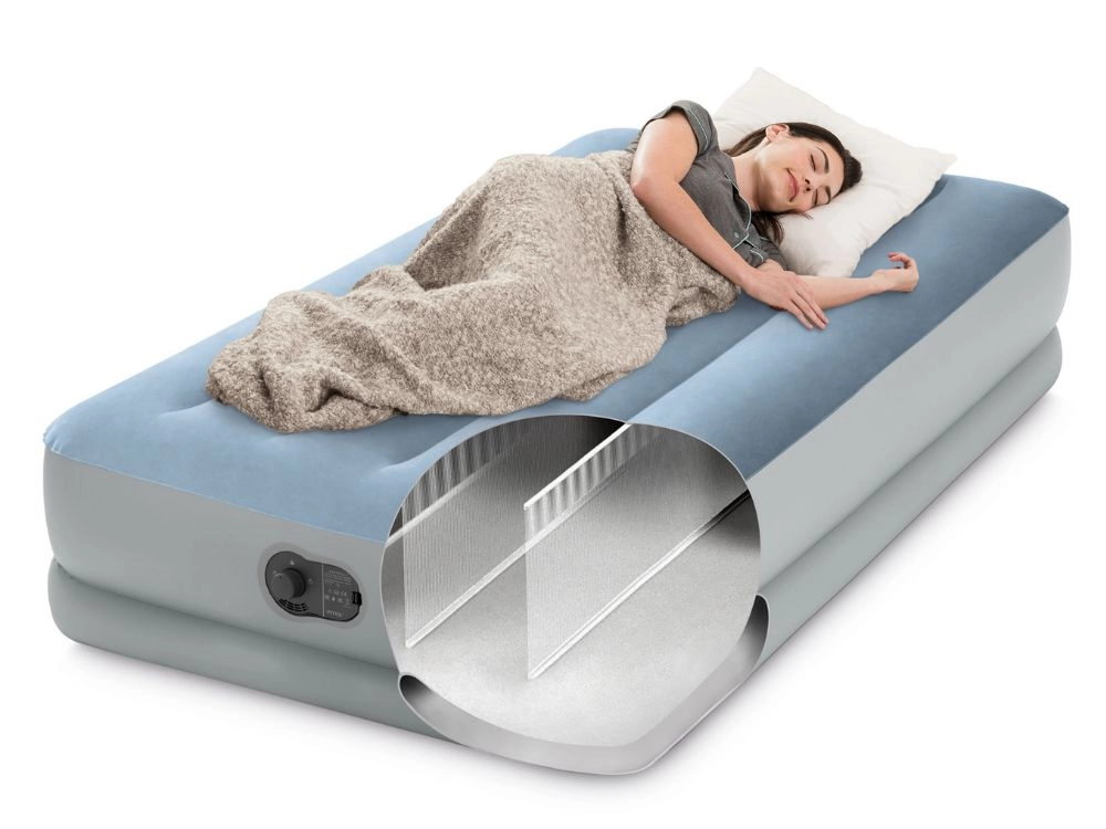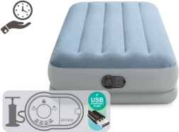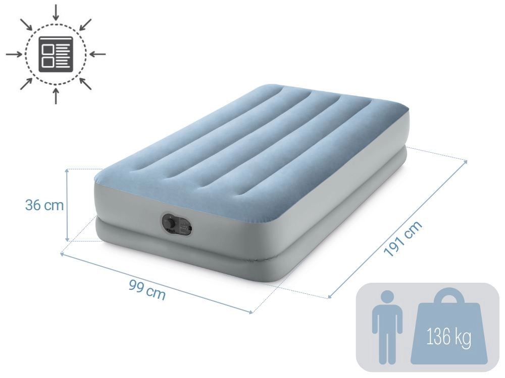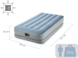 ¿Busca una solución cómoda para invitados, viajes o la casa de campo? El colchón inflable Intex combina confort, estabilidad y movilidad. La superficie aterciopelada es agradable al tacto y evita que la sábana se deslice, mientras que las cámaras reforzadas Fiber-Tech y el armazón Dura-Beam aportan firmeza al lecho sin molestas oscilaciones.