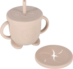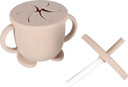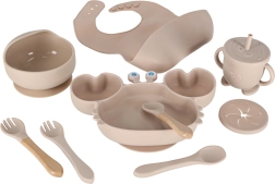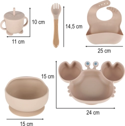 Este práctico set de silicona suave incluye todo lo necesario para la alimentación diaria de los más pequeños: plato con forma de cangrejo y tres compartimentos, cuenco con ventosa, vaso con dos tapas (incluida tapa con pajita), cuatro cubiertos y babero ajustable con bolsillo. Las ventosas del plato y el cuenco evitan que se vuelquen o se deslicen, mientras que los compartimentos ayudan a separar las porciones.