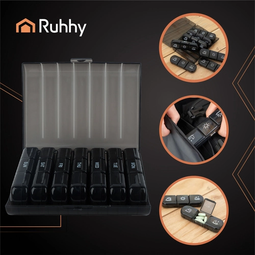 El práctico organizador semanal de pastillas RUHHY ayuda a mantener el orden y la regularidad de la dosificación durante toda la semana. Incluye 7 cajas extraíbles con marcación clara de los días y división en mañana, mediodía y noche. Gracias a su estuche robusto, es compacto, seguro e ideal para casa, trabajo y viajes.