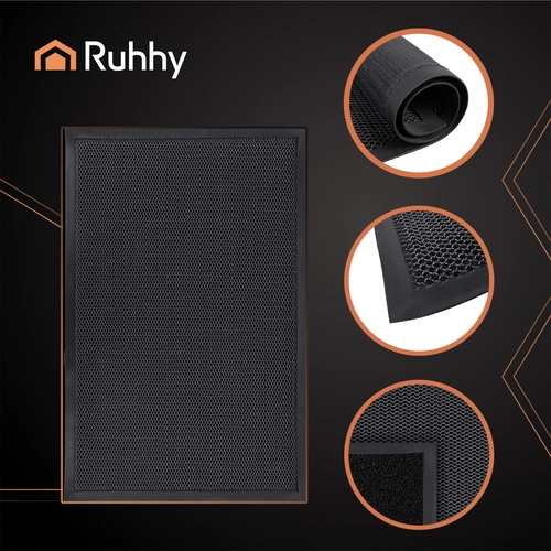 El felpudo RUHHY es una solución fiable para entradas de casas, apartamentos, oficinas y tiendas. Su estructura rígida y resistente con rejilla 3D raspa eficazmente barro, arena y agua del calzado, manteniendo el interior limpio por más tiempo. Los bordes elevados ayudan a retener la suciedad y la humedad sobre el felpudo y evitan que las esquinas se doblen.