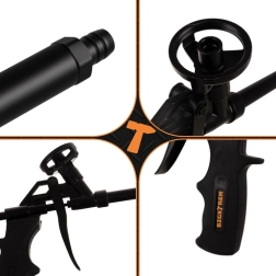 El cuerpo totalmente metálico ofrece fiabilidad y una larga durabilidad incluso con uso intensivo. El mango ergonómico con superficie antideslizante se adapta cómodamente a la mano y minimiza la fatiga durante trabajos prolongados. La pistola es compatible con la mayoría de los cartuchos estándar de espuma PU.