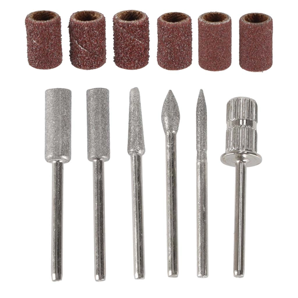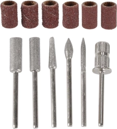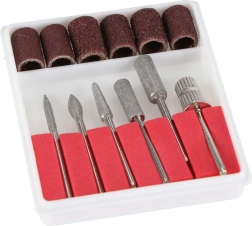 - Equipamiento completo: 6 brocas metálicas (puntiaguda, cilíndrica, cónica, esférica, de aguja, mandril para aros de lijado) + 6 capuchones de lijado de diferentes granos.