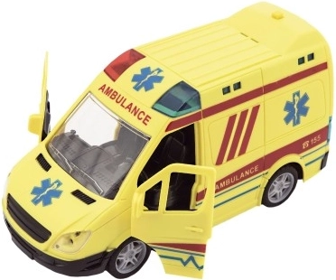 Añade a tu colección de cochecitos esta ambulancia de plástico detalladamente elaborada. Gracias a las puertas abatibles, los niños pueden mirar dentro y recrear escenas de acciones profesionales de rescate.