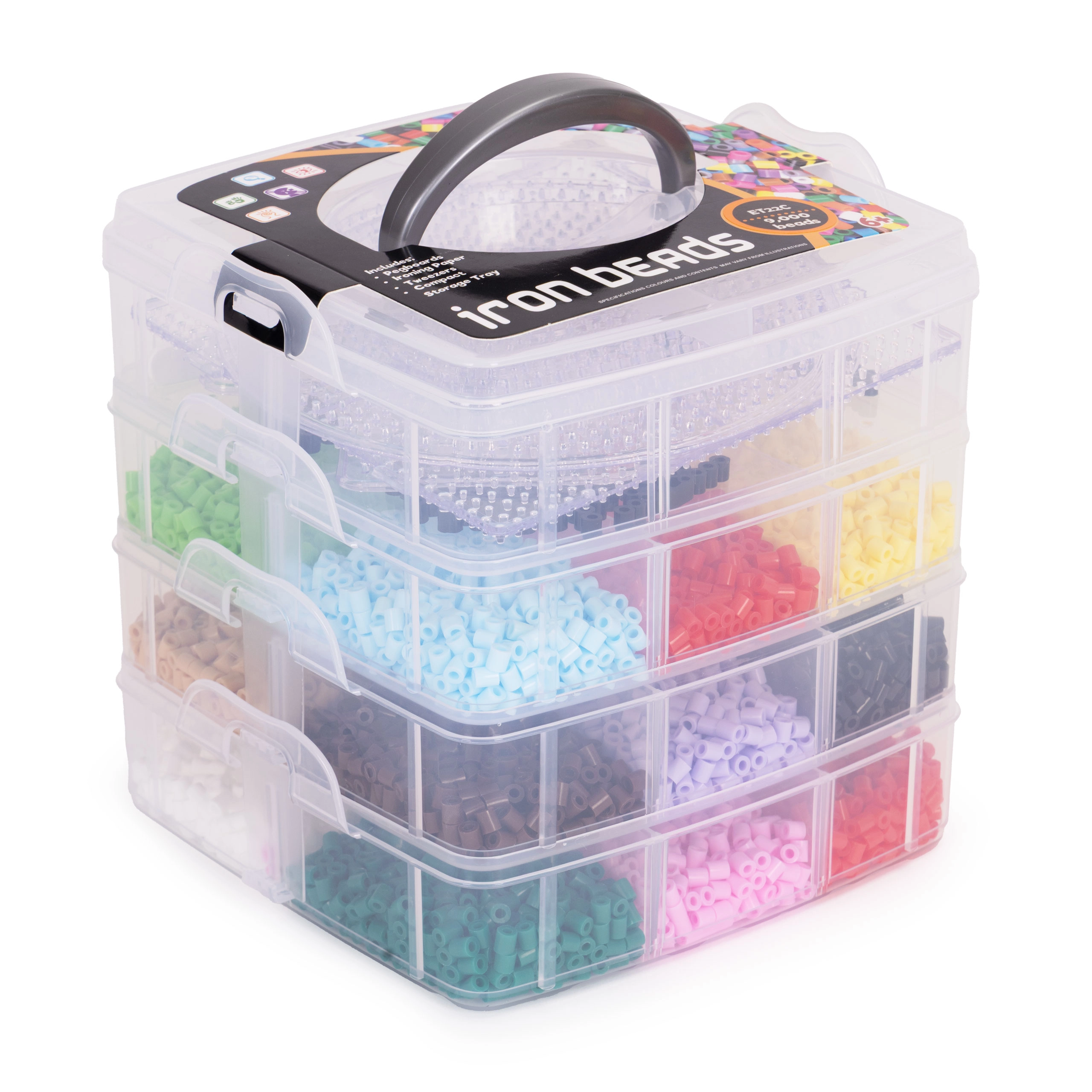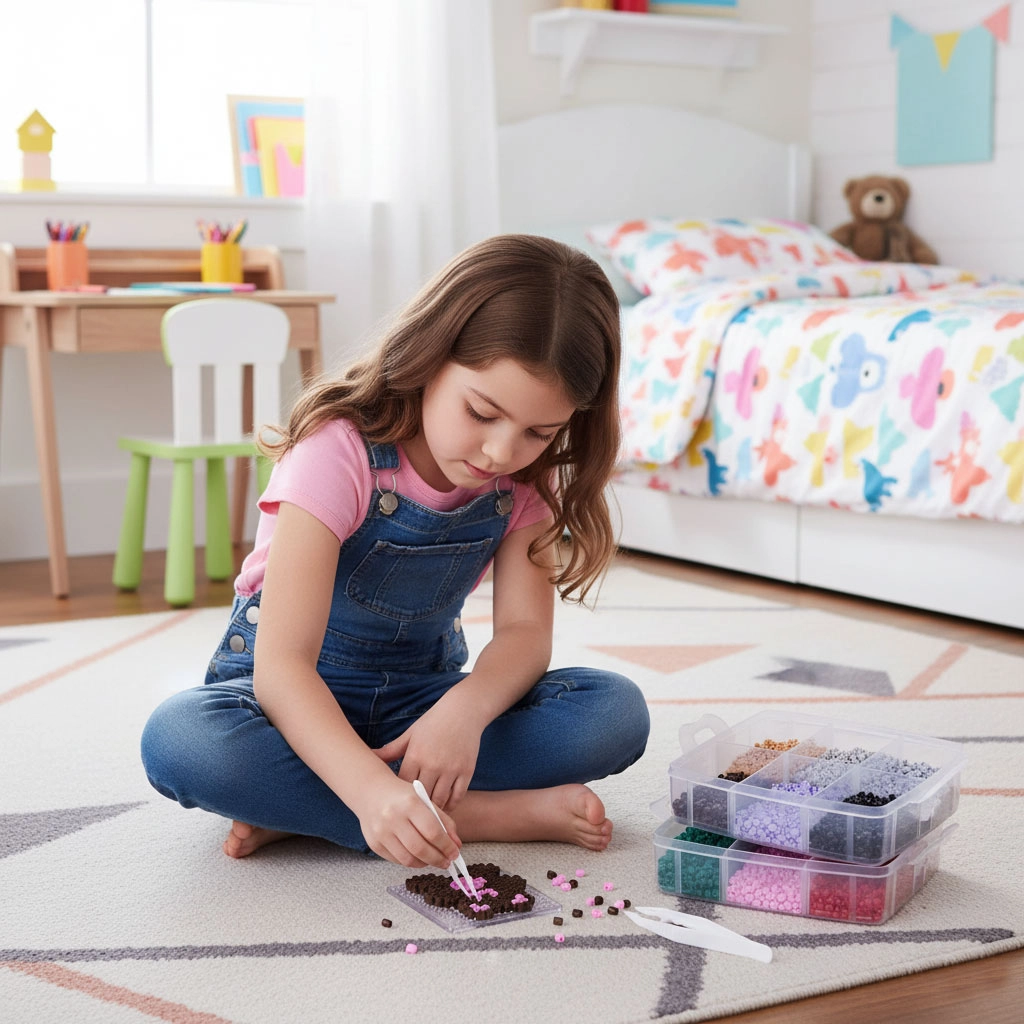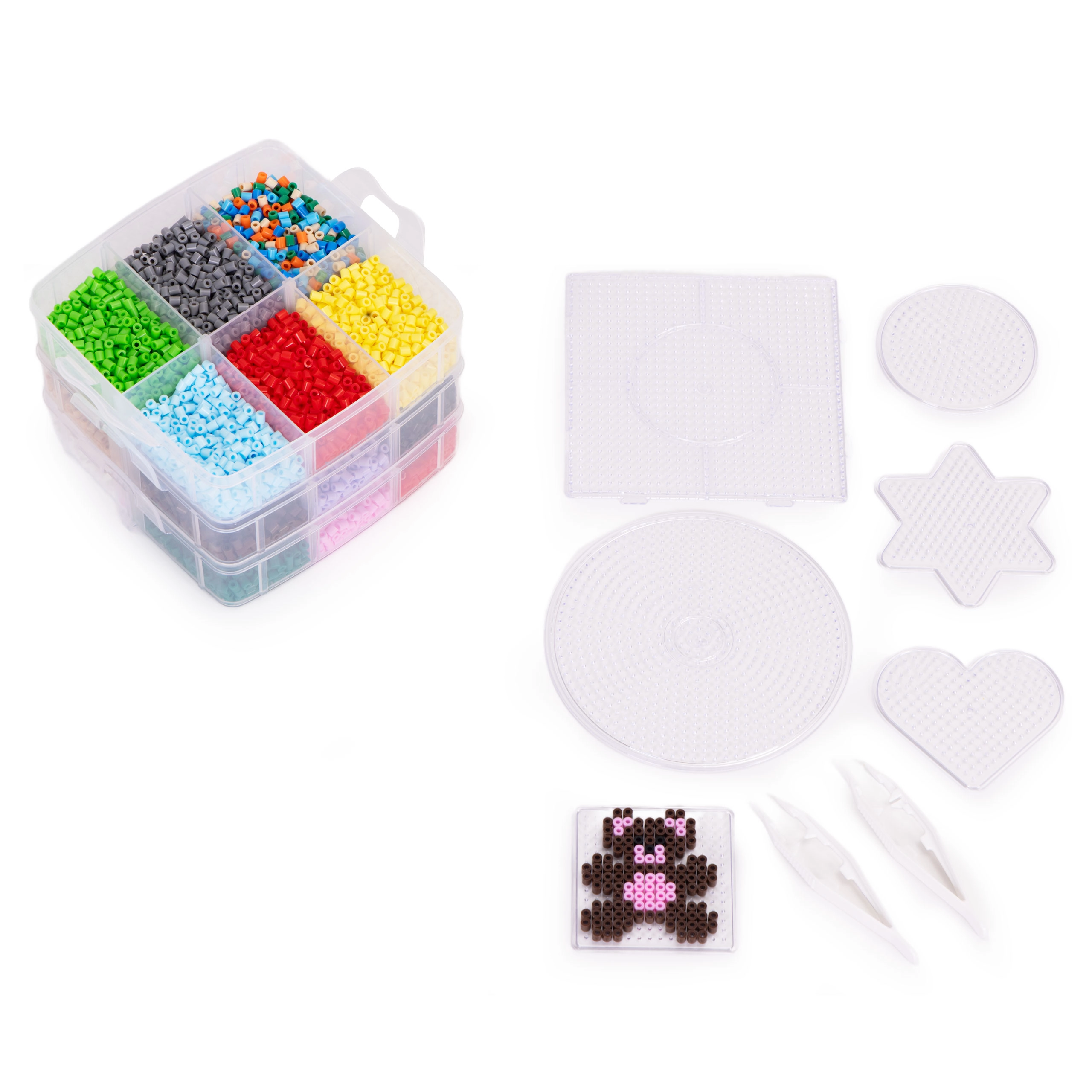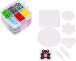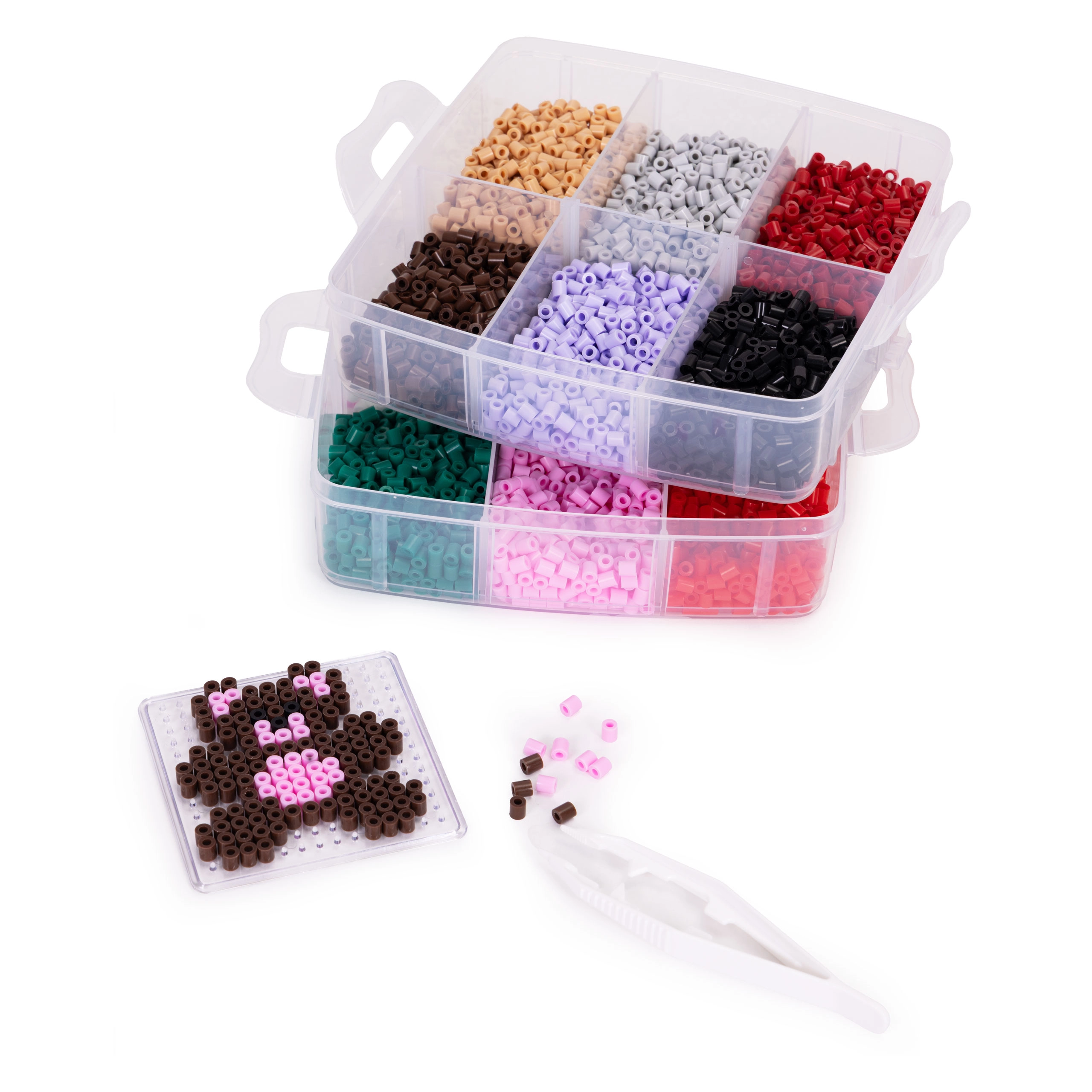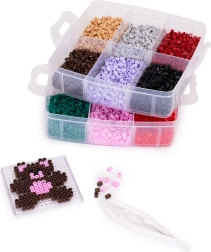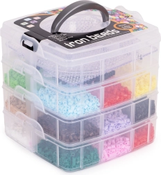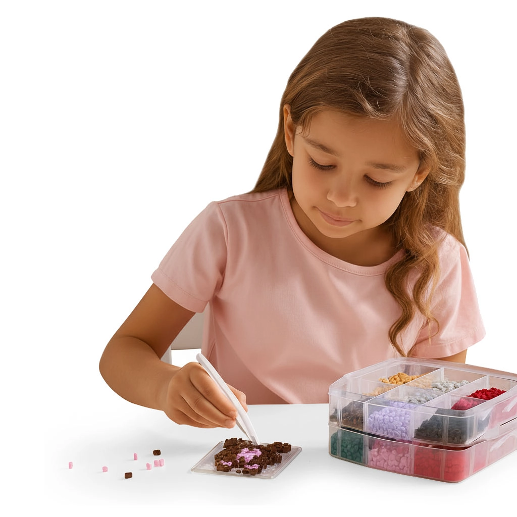 Contenido del paquete: hasta 9000 cuentas en muchos colores, 6 bases (círculo, cuadrado, estrella, corazón, etc.), 2 pinzas, papeles para planchar, plantillas de diseño y un amplio organizador con compartimentos. Gracias a la caja apilable, todo queda bien ordenado y listo para seguir creando en casa o de viaje.