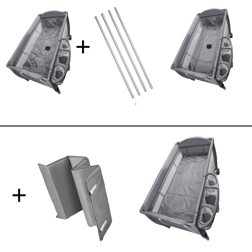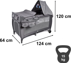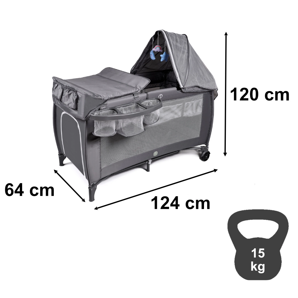 Práctica cuna de viaje para bebés y niños pequeños con cama de dos niveles, cambiador y mosquitera con juguetes. Gracias al plegado rápido, las ruedas con freno y los laterales de malla transpirable, garantiza un sueño cómodo y un cuidado sencillo en casa y de viaje. Los organizadores y bolsillos mantienen todos los accesorios a mano.