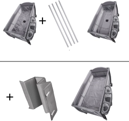 - cuna, segundo nivel, colchón con velcros, capota con mosquitera y 3 juguetes, 4 varillas de montaje, cambiador, organizador, bolsa, instrucciones
