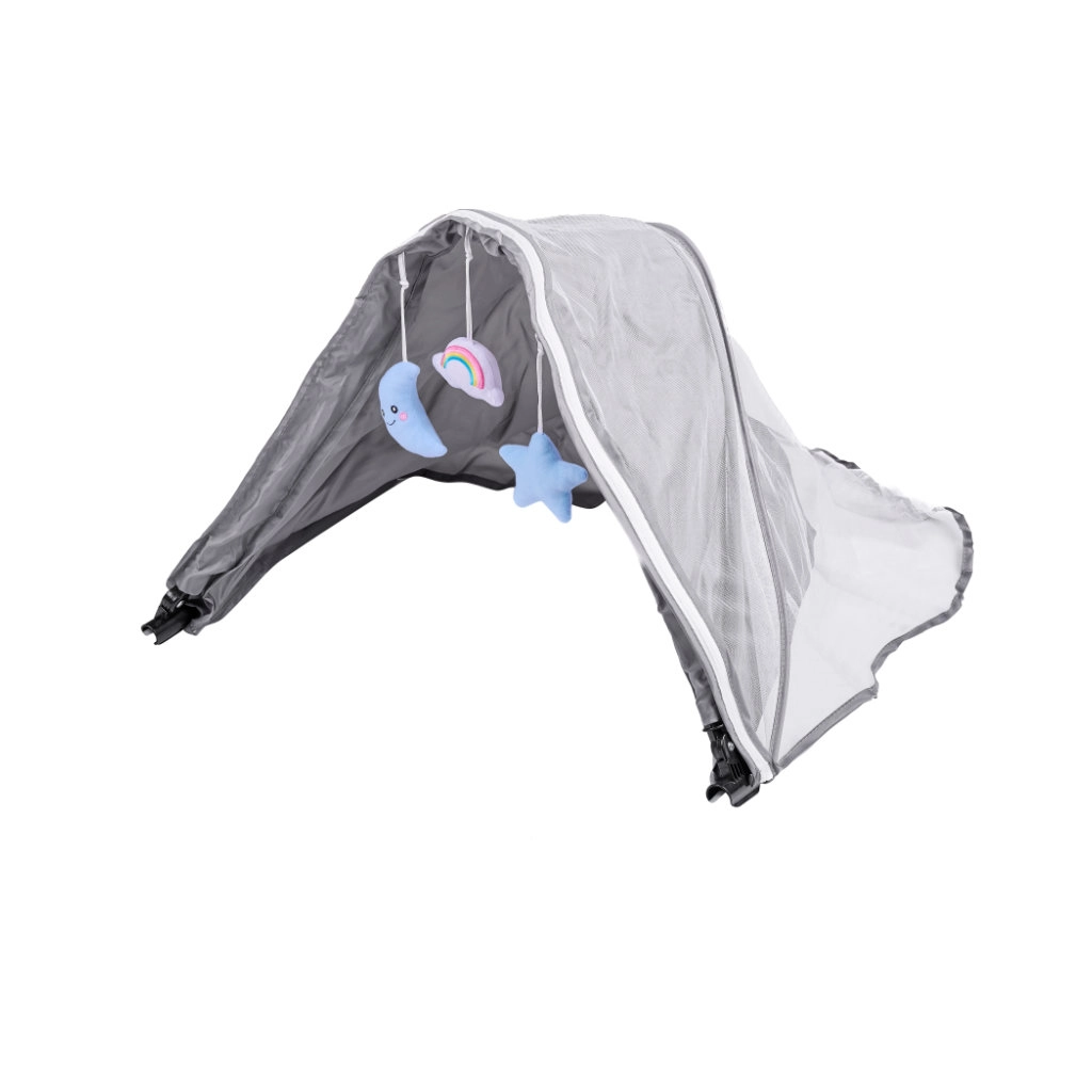 La malla ligera protege de los insectos y a la vez ventila. Los juguetes de peluche colgantes (luna, arcoíris, estrella) favorecen el desarrollo sensorial y entretienen al bebé.