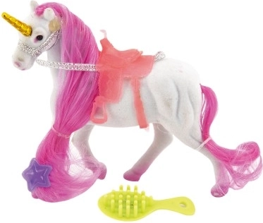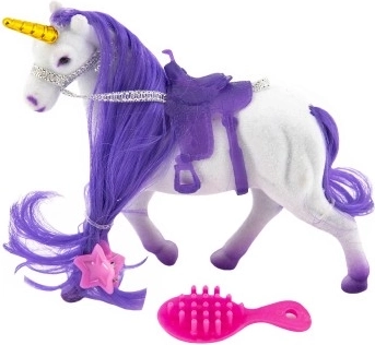Este elegante unicornio hará las delicias de cualquier niño que ame las criaturas mágicas y el mundo de fantasía. Gracias a su acabado suave y aterciopelado y a la crin para peinar, los pequeños estilistas disfrutarán de mucha diversión creativa. También se incluyen accesorios para el arreglo de la crin y una silla de montar para paseos cómodos en un mundo imaginario.