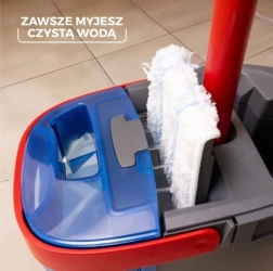 El práctico cubo con asa ergonómica facilita el transporte, el vaciado y el enjuague de la mopa, mientras que los compartimentos separados garantizan la limpieza.