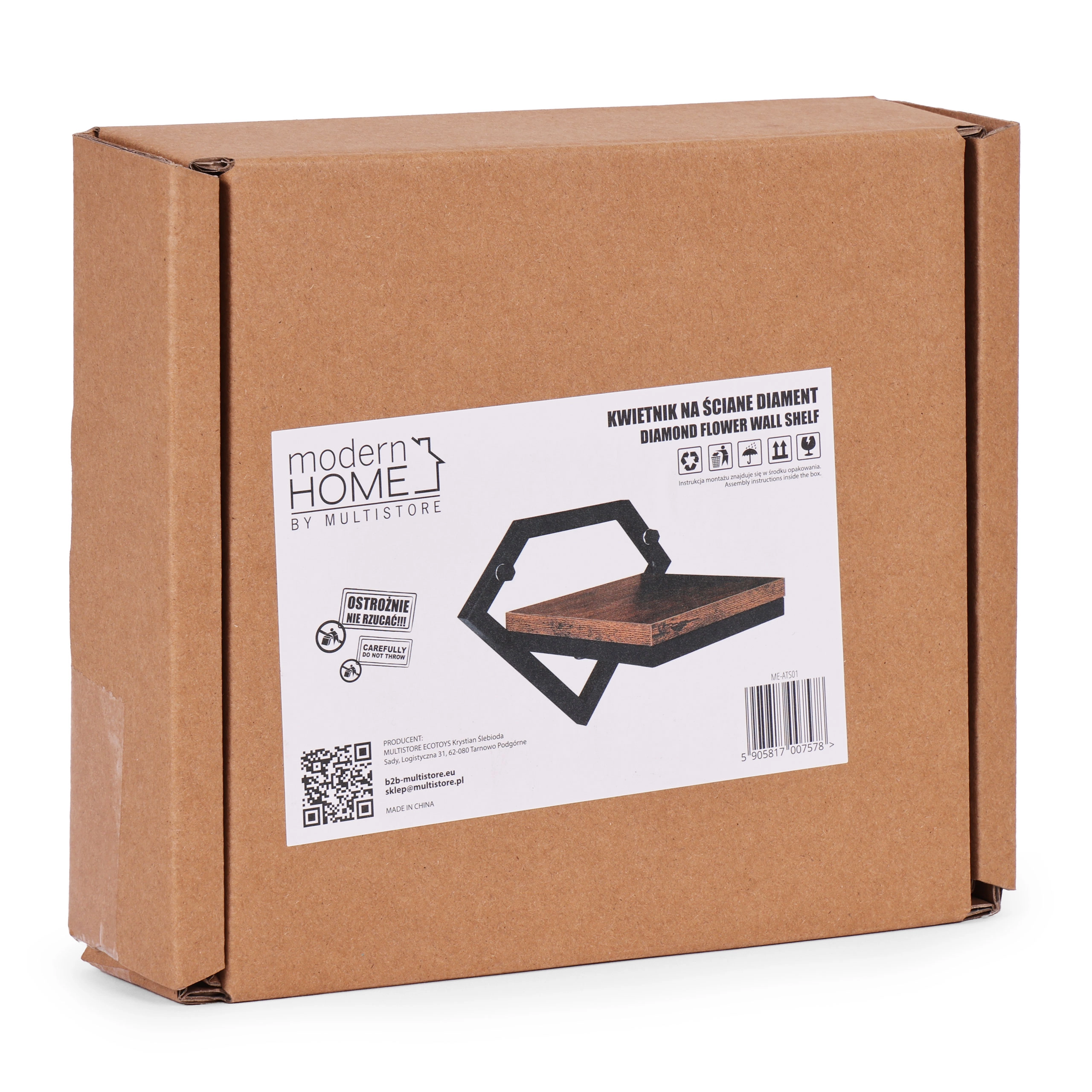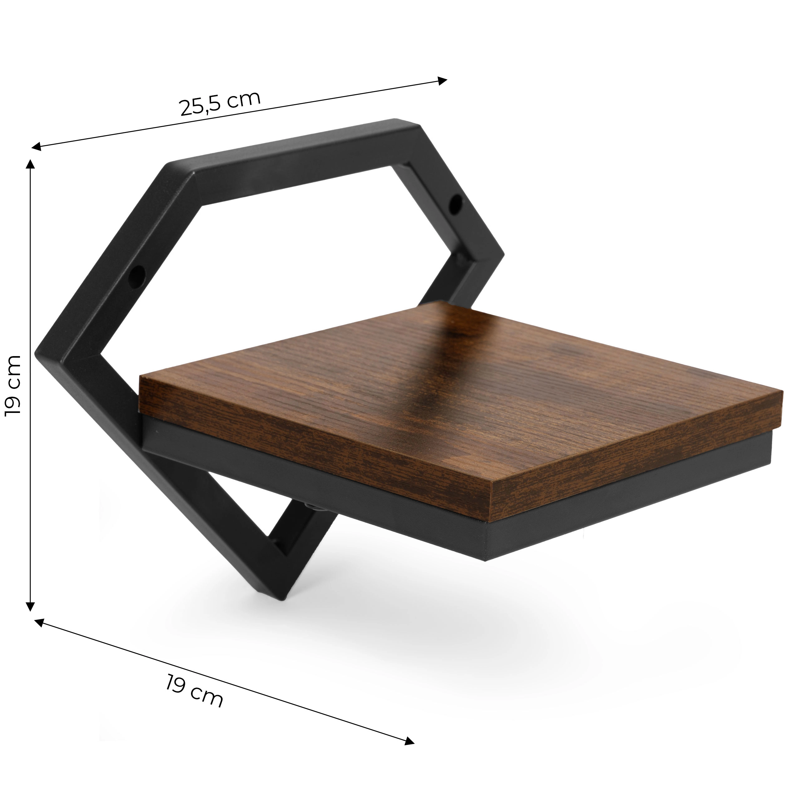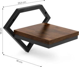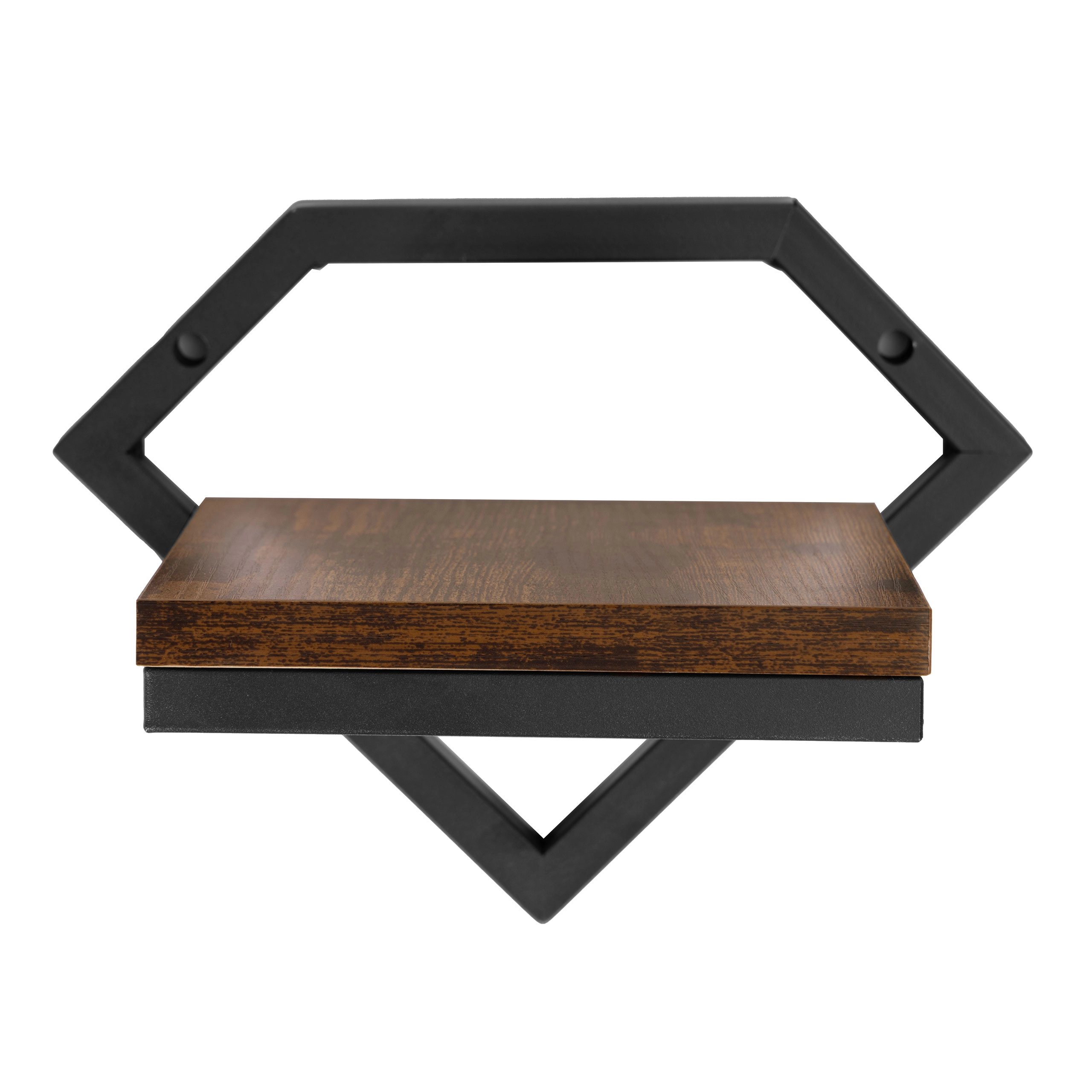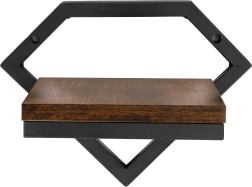 El marco geométrico en forma de diamante en negro mate y la balda con acabado tipo madera crean un elemento loft llamativo que encaja en salón, cocina e incluso baño.