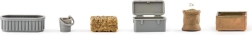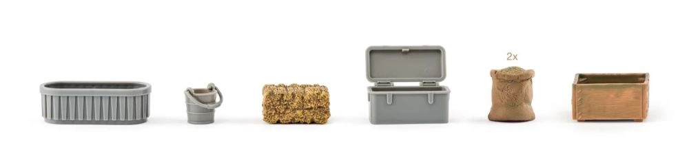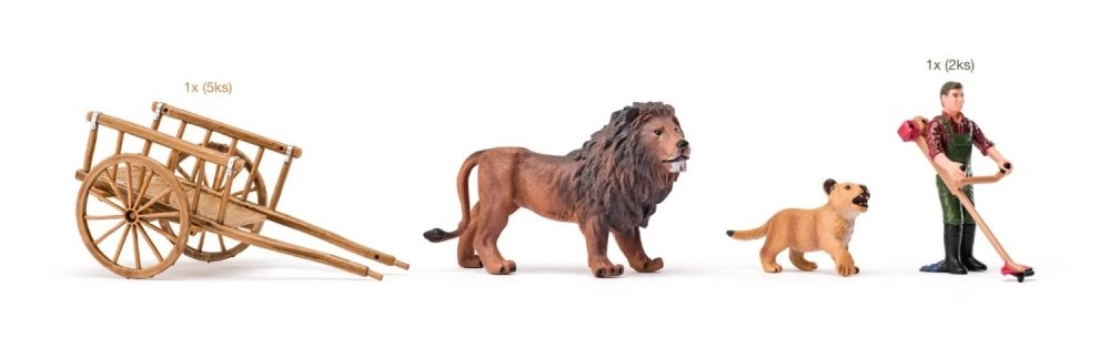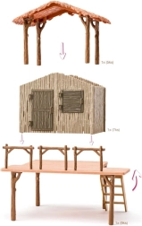 - Cabaña elevada con barandilla y escalera, cercados, carrito, mini herramientas, figura humana, figuras de animales (p. ej., elefante, cría de elefante, jirafa, cebra, cría de cebra, león, cocodrilo, hipopótamo, antílope, facóquero, suricata, aves, etc.)