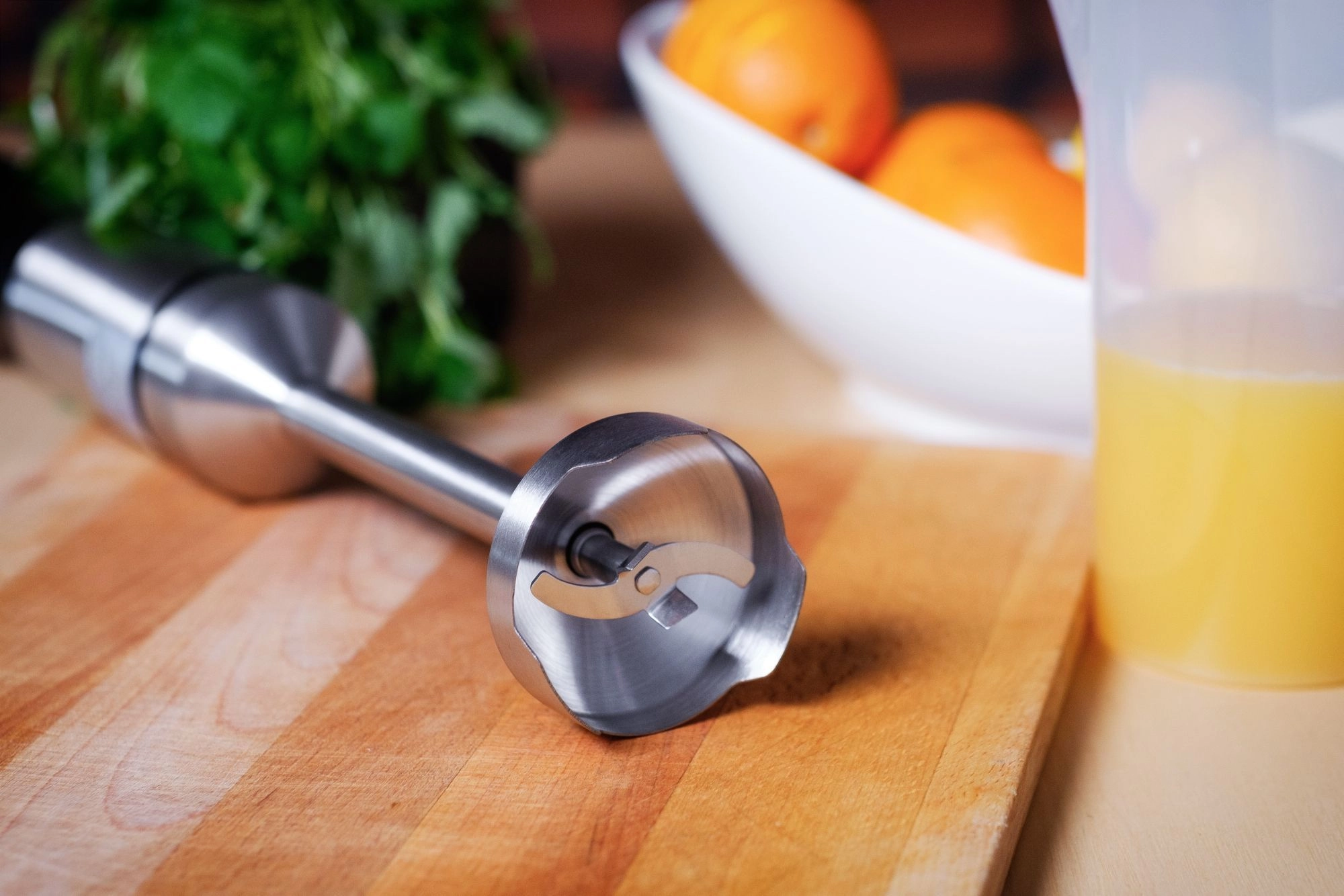 El resistente pie mezclador metálico y las cuchillas dobles de acero inoxidable garantizan resultados finos y una larga vida útil incluso con un uso frecuente.