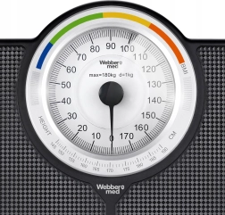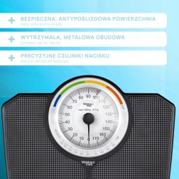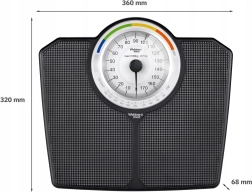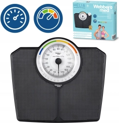 La clásica báscula personal mecánica WEBBER con capacidad de hasta 180 kg ofrece mediciones fiables sin pilas. Su gran esfera legible con división de 1 kg permite lecturas rápidas y precisas; las zonas de color y la función de IMC ayudan con un control orientativo del peso. Construcción resistente, superficie antideslizante y elegante diseño en negro que encaja en cualquier baño.