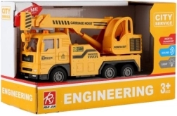 El vehículo se ilumina gracias a las pilas incluidas y la grúa con tracción por inercia permite un manejo sencillo. Este modelo es ideal para los pequeños aficionados a las máquinas de construcción que quieren sentirse como verdaderos ingenieros.