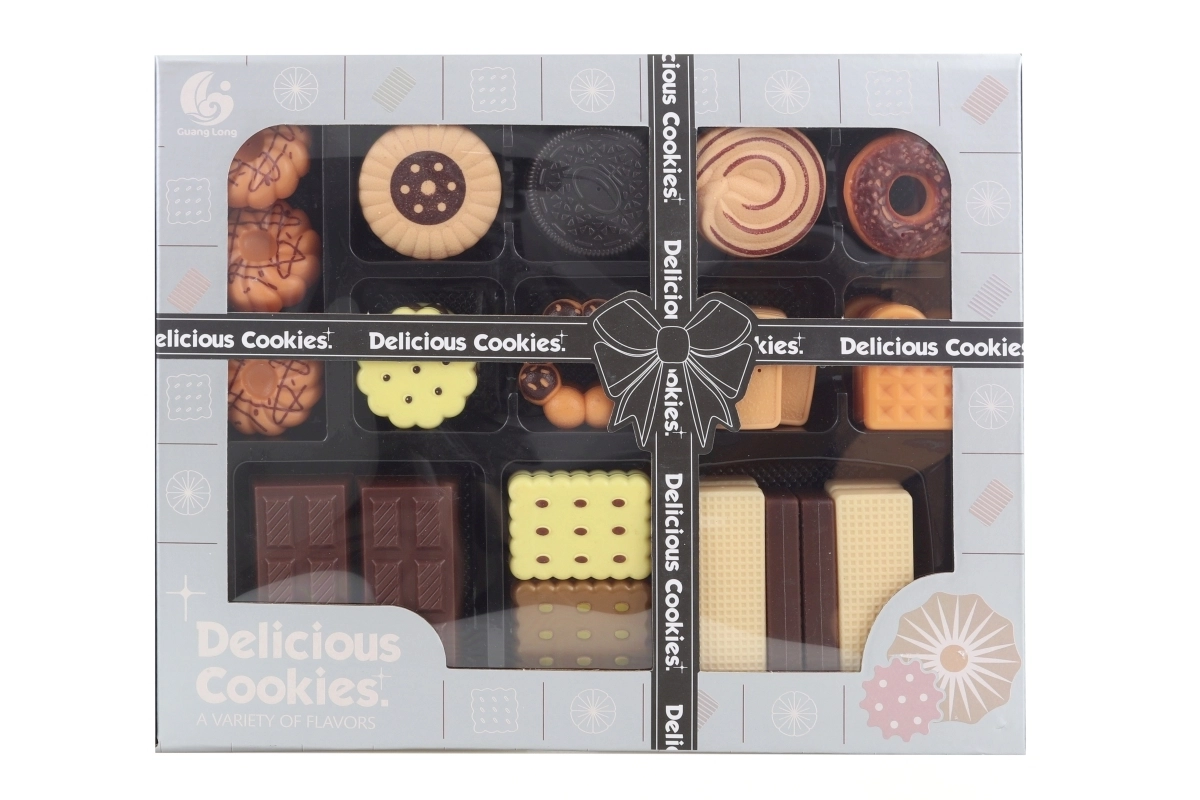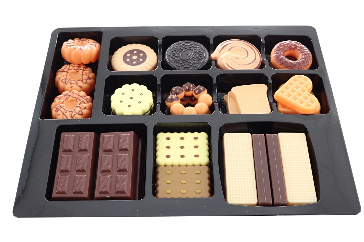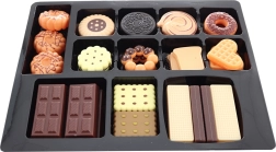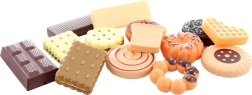 El set incluye una selección de dulces — obleas, galletas, chocolate y gofres — ideal para jugar a la tienda o a la cocina. El práctico embalaje en una caja de regalo lo convierte en un regalo perfecto para pequeños chefs.