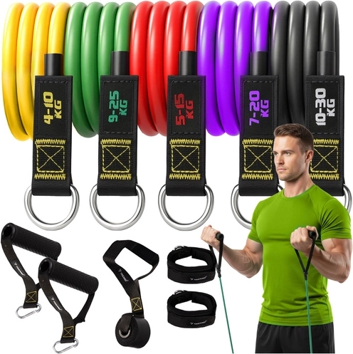 Juego completo de bandas de resistencia TRIZAND para un entrenamiento eficaz en casa y en el gimnasio. Incluye 5 bandas con carga de 4–30 kg, asas de mano, correas para tobillos, tope para puerta y estuche. Gracias al látex resistente, su alta elasticidad y mangos antideslizantes, podrás entrenar con seguridad todo el cuerpo: espalda, brazos, piernas, abdomen y glúteos.