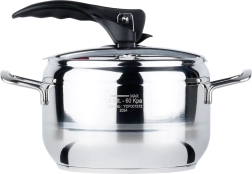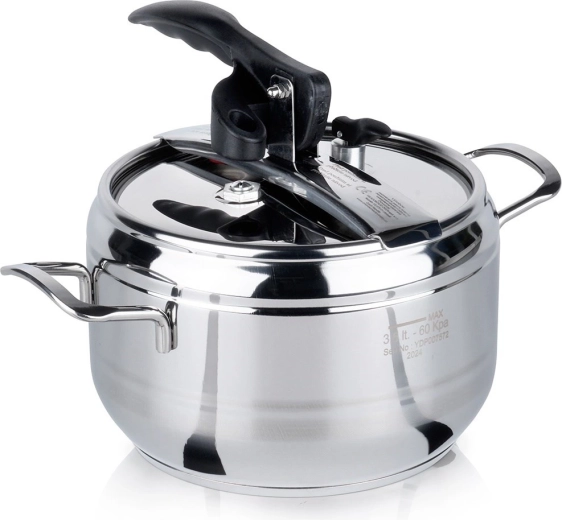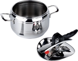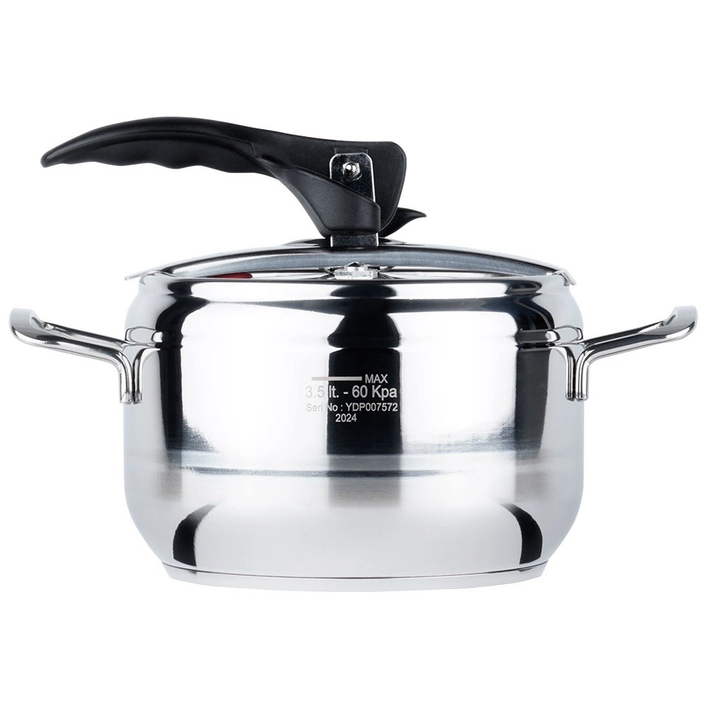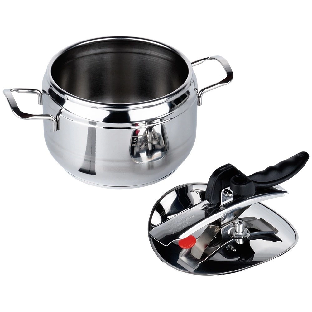 Olla a presión compacta de acero inoxidable con capacidad de 3,5 l para cocinar a presión de forma rápida, económica y saludable. Gracias al fondo de 3 capas, la regulación de presión y las dos válvulas de seguridad, acorta el tiempo de preparación y ahorra energía. Apta para gas, electricidad, vitrocerámica, halógeno e inducción y se puede lavar en lavavajillas (sin tapa).