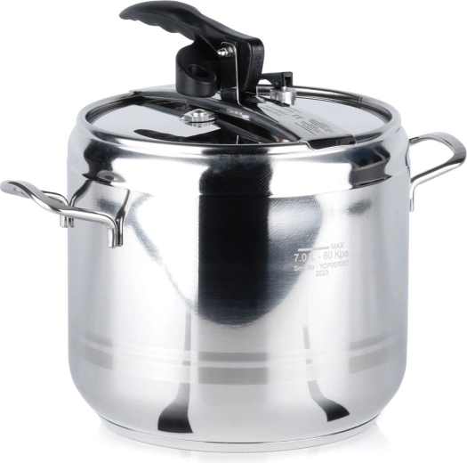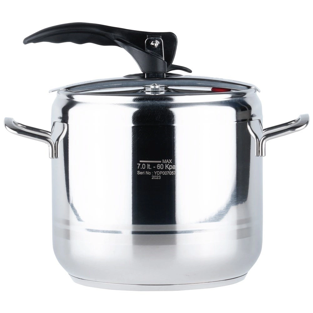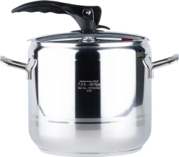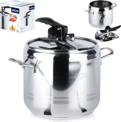 Práctica olla a presión de 7 litros fabricada en acero inoxidable de alta calidad para una cocción rápida y eficiente. Gracias a la cocción a presión acorta el tiempo de preparación, ahorra energía, conserva el sabor y los nutrientes y ofrece un funcionamiento seguro con dos válvulas de seguridad y estructura robusta con fondo tricapa. Apta para todo tipo de cocinas, incluida la inducción.