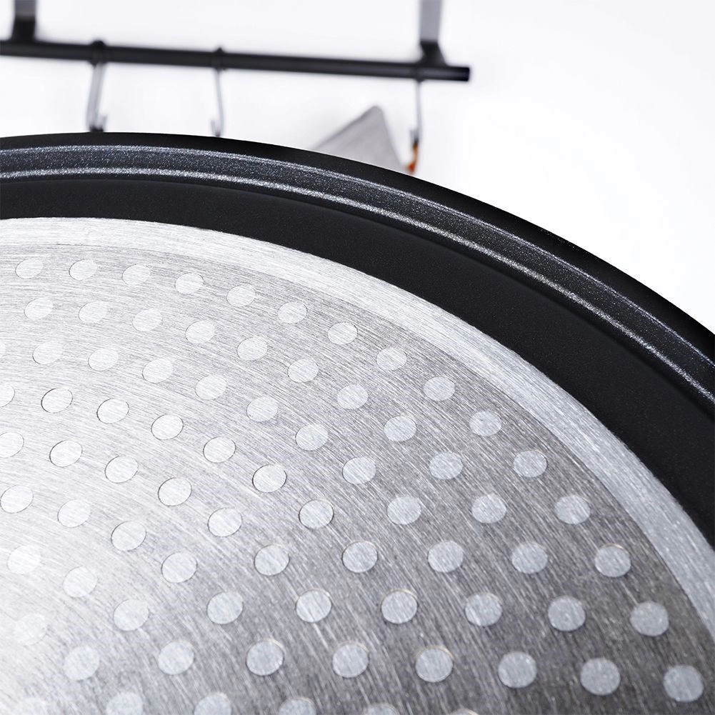 El recubrimiento especial garantiza el desmolde suave de la masa, un cocinado uniforme y una fritura más saludable con un mínimo de grasa.