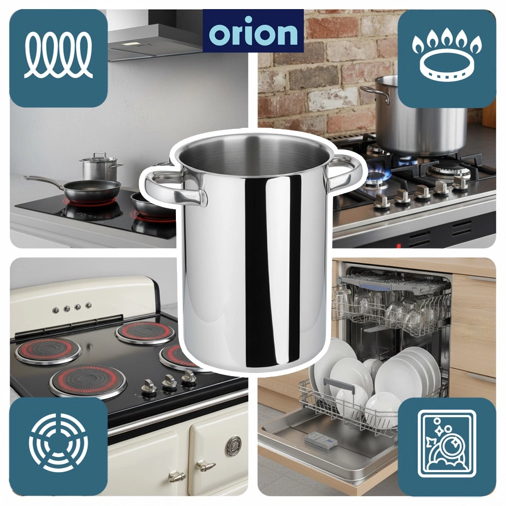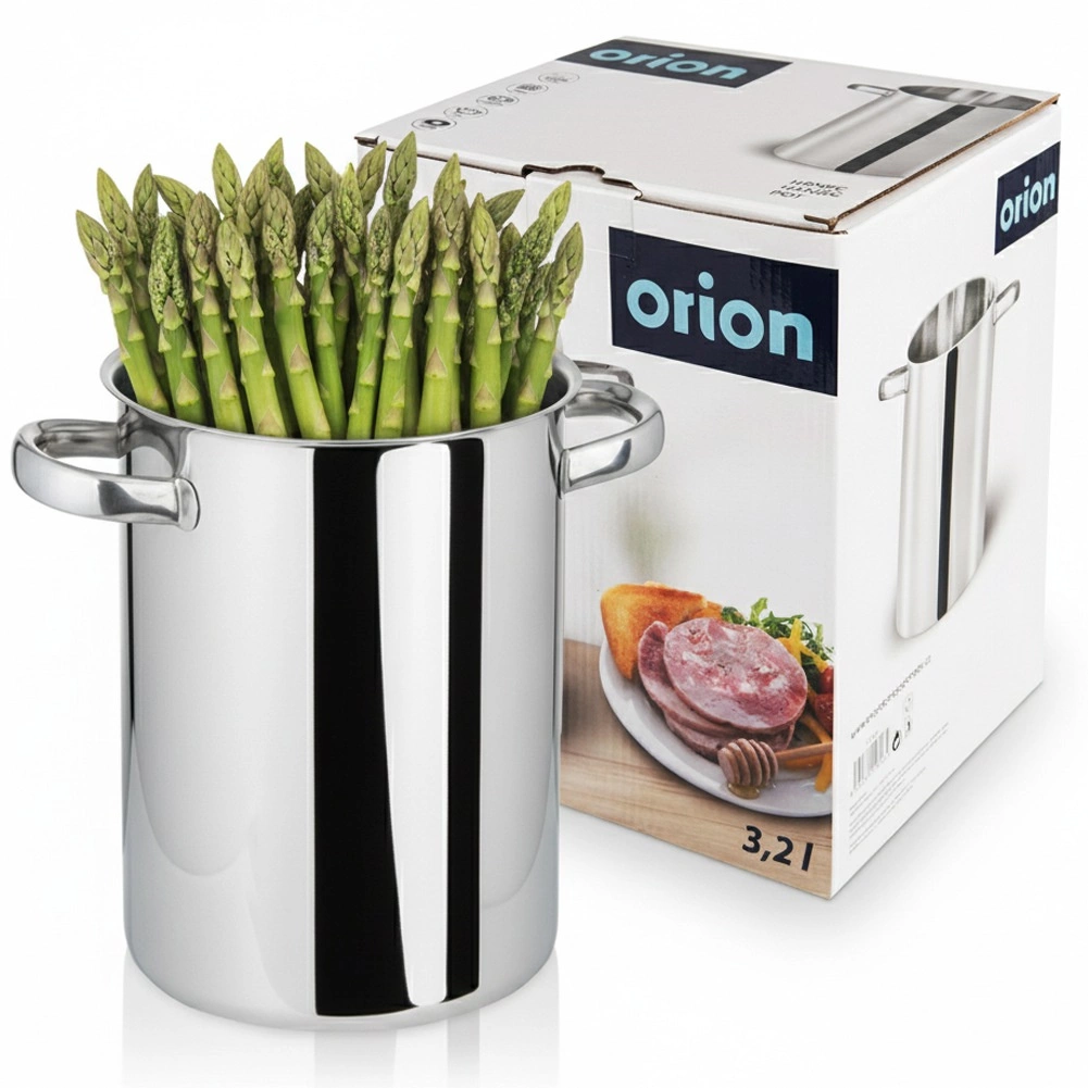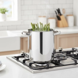 Práctica olla alta de acero inoxidable 304 de calidad, diseñada para cocinar cómodamente espárragos, espaguetis y otros alimentos largos. El elegante exterior pulido y el interior mate aportan un aspecto profesional y facilitan la limpieza. Gracias a las robustas asas remachadas, se manipula de forma segura incluso cuando está llena.