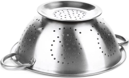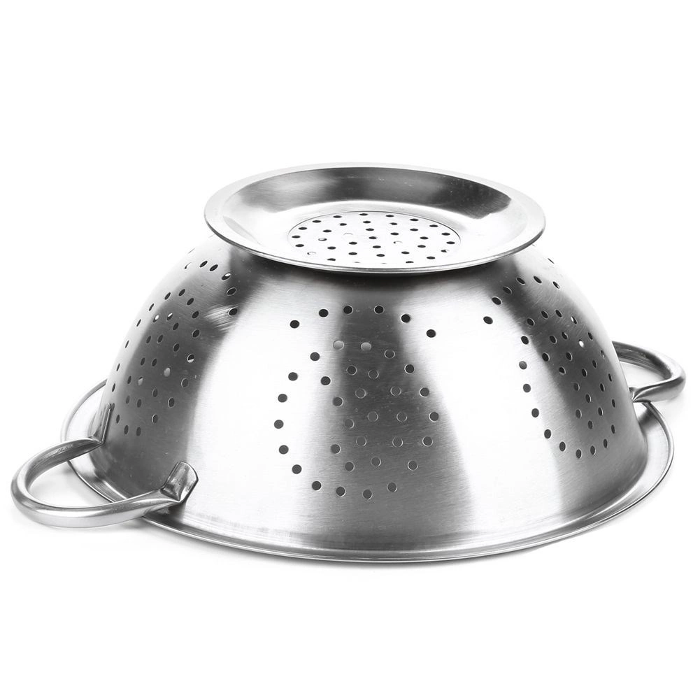 Colador universal de acero inoxidable en forma de cuenco con un diámetro de 24 cm, base estable y dos asas, ideal para lavar frutas y verduras, así como para escurrir pasta o arroz. Acero inoxidable resistente, numerosos orificios de drenaje y asas ergonómicas garantizan un uso cómodo y seguro en cualquier cocina.