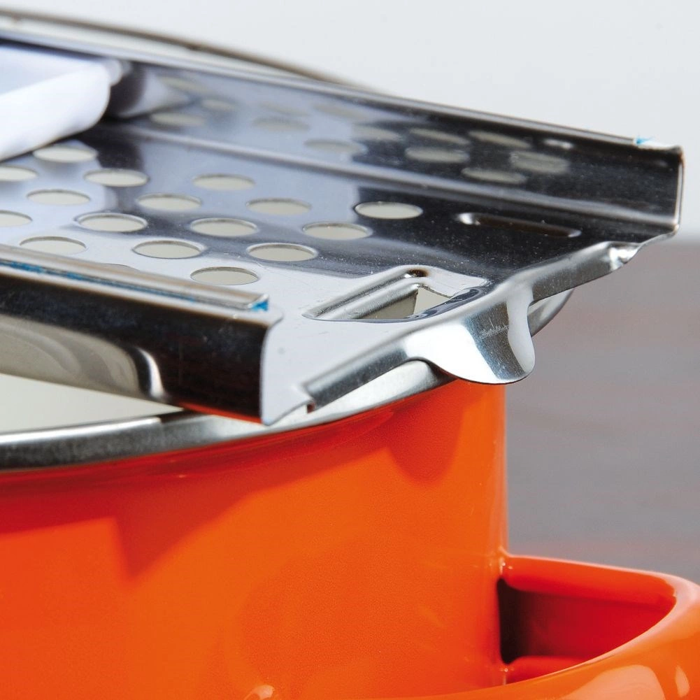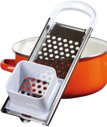 El práctico tope y el asa permiten rallar y presionar cómodamente directamente sobre la olla sin desorden.