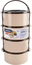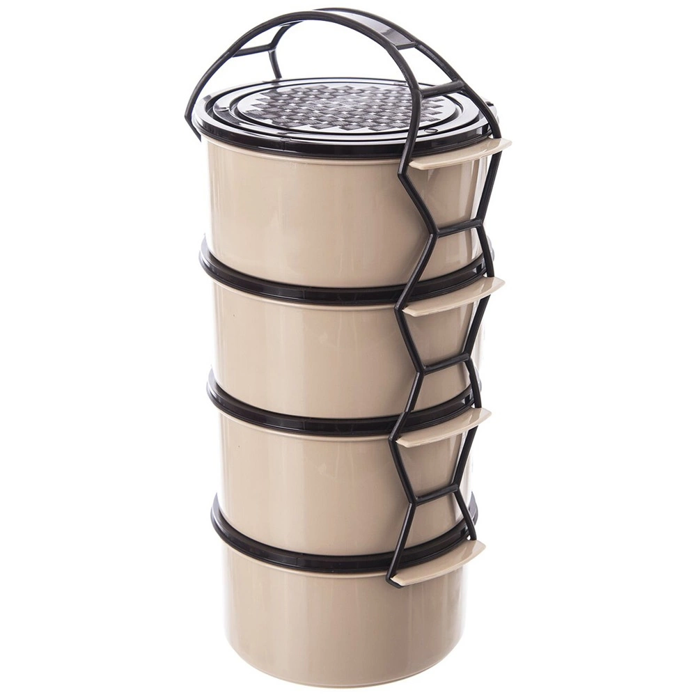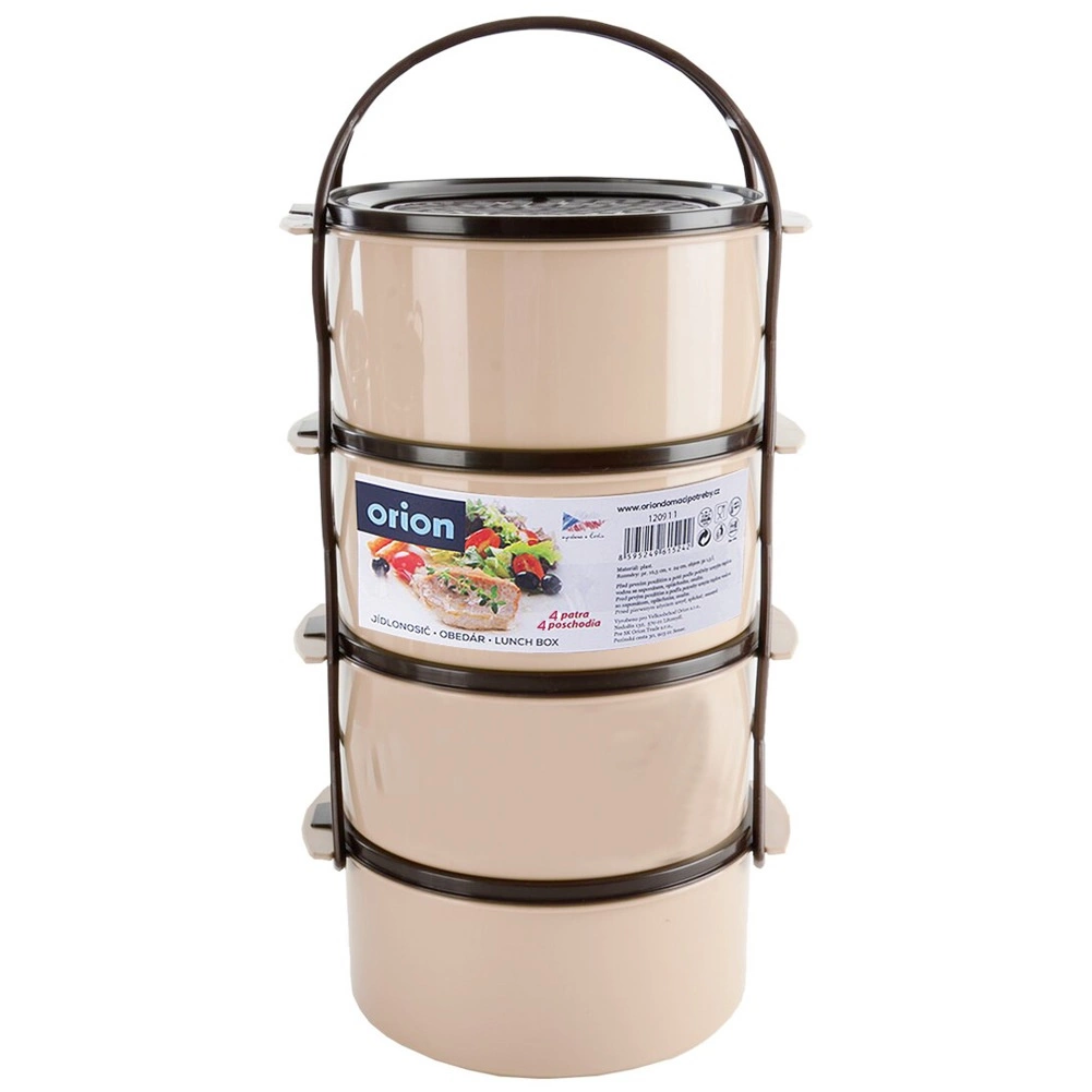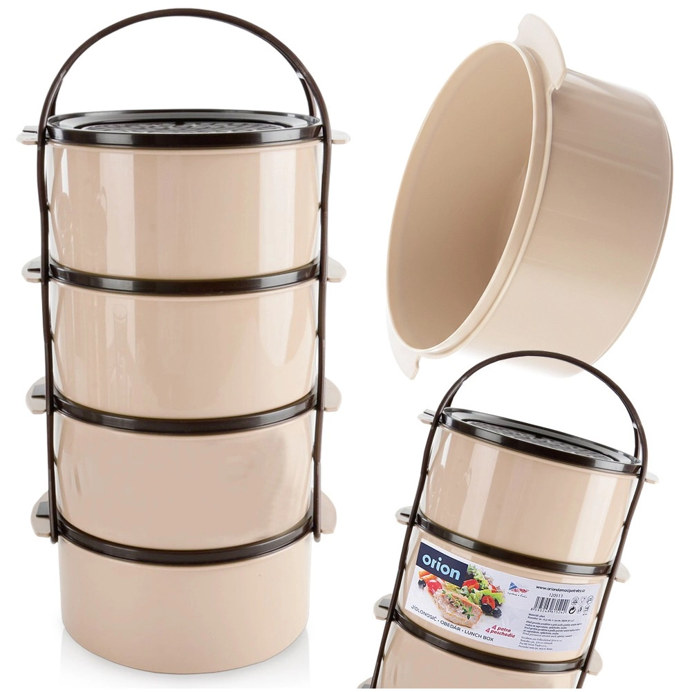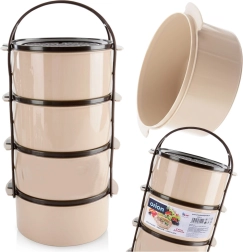 Práctica fiambrera de cuatro pisos con capacidad de 4×1,5 l para separar los platos de forma clara. Dispone de recipientes apilables con tapas, un marco portante con asa resistente y un diseño duradero en color beige‑marrón. Apta para lavavajillas, nevera, congelador y para microondas sin tapas.